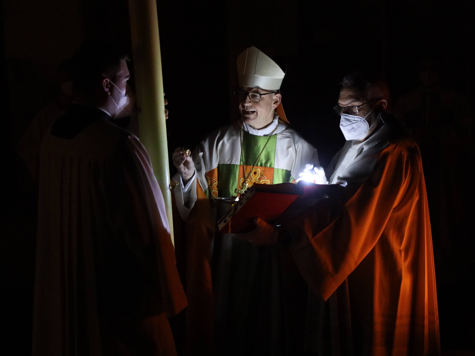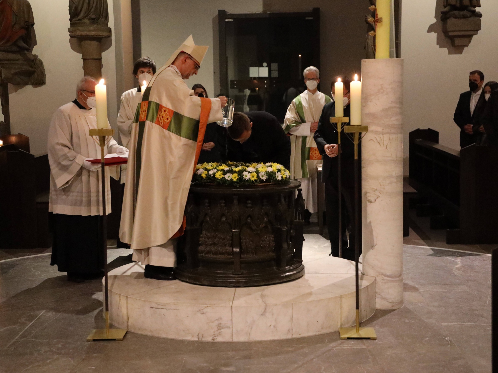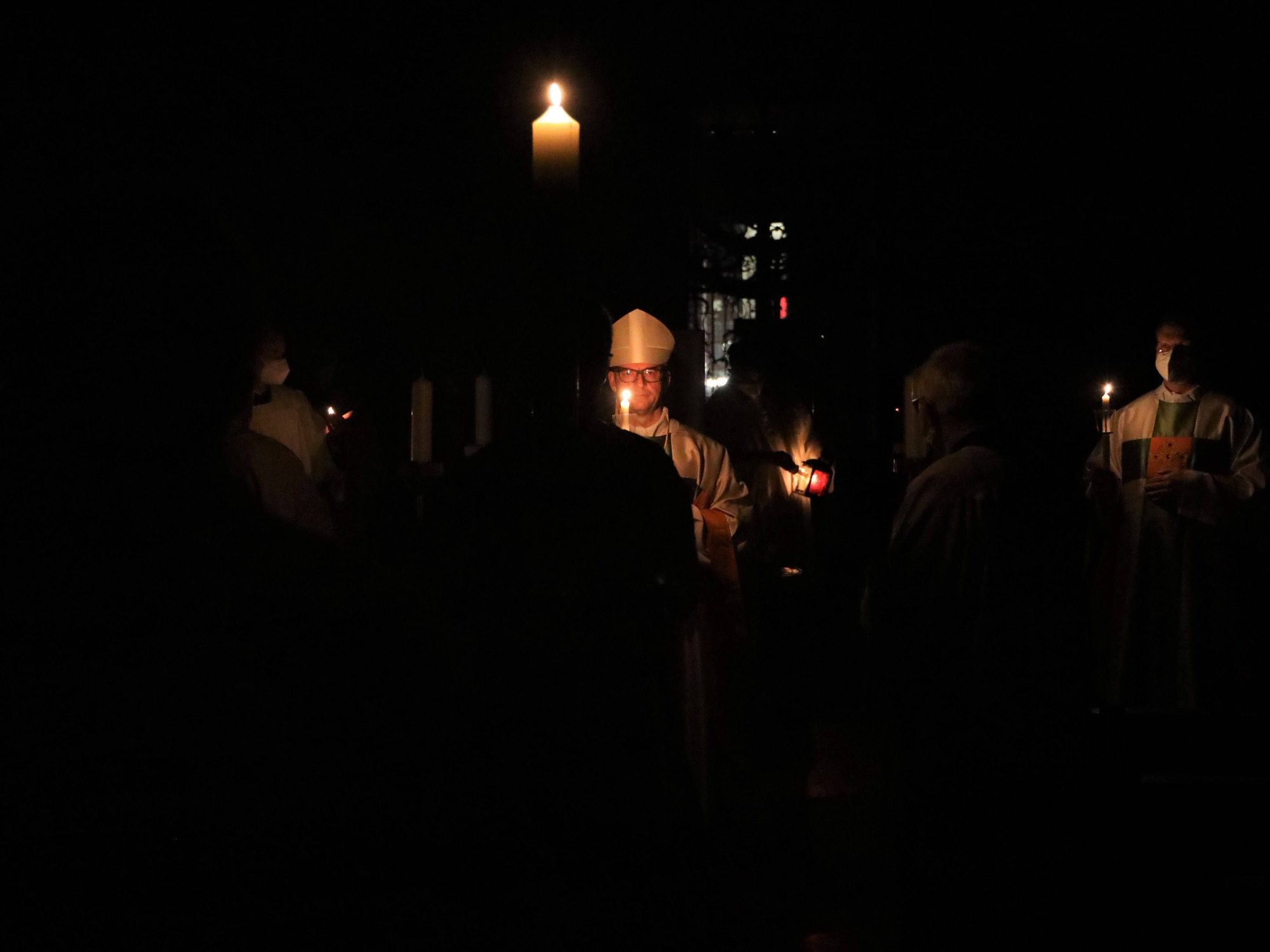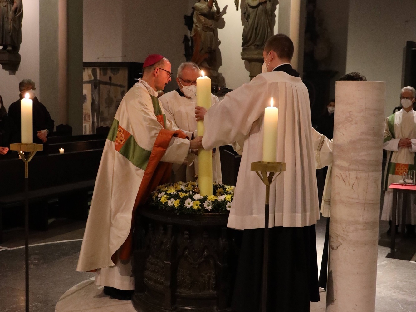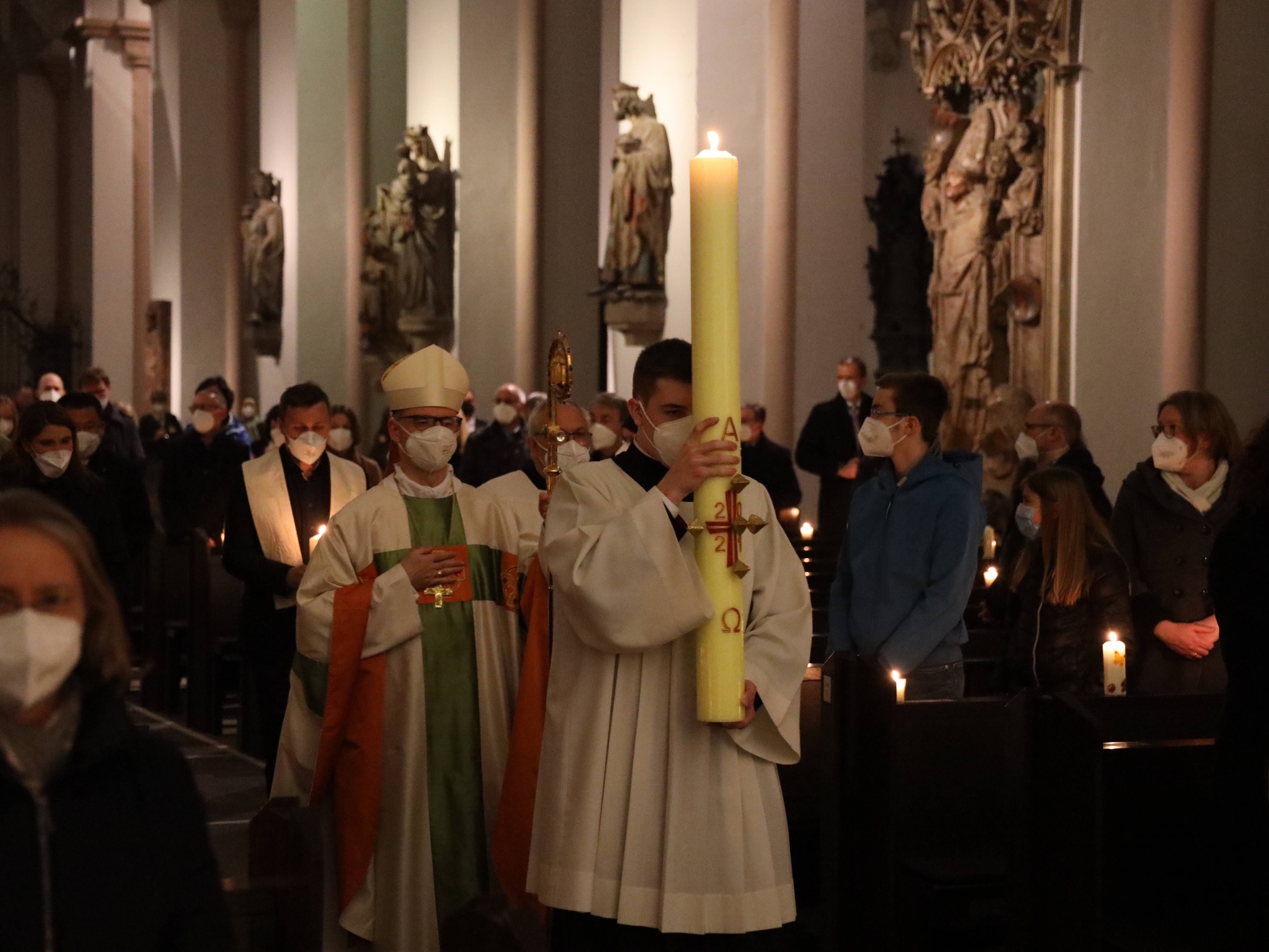 Die Feier der Osternacht begann am Feuer im Domkreuzgang. Nach der Segnung des Osterfeuers entzündete Bischof Jung die große Osterkerze an den Flammen mit den Worten: „Christus ist glorreich auferstanden vom Tod. Sein Licht vertreibe das Dunkel der Herzen.“ Danach wurde das Osterlicht in Begleitung von Mitgliedern des Domkapitels in den dunklen Kiliansdom getragen und an die Gläubigen weitergereicht. Während der Lichtfeier sang Diakon Dr. Martin Faatz das österliche Exsultet, den Lobgesang auf die Osterkerze. Lektoren trugen Lesungen aus dem Alten Testament vor. Beim Gloria läuteten die Glocken des Domes nach den stillen Tagen seit Gründonnerstag wieder. Lesung und Evangelium des Neuen Testaments berichteten von der Auferstehung Jesu. Der Lichtfeier schlossen sich die Taufe Wegels, die allgemeine Tauferneuerung und die Eucharistiefeier an. Den musikalischen Rahmen gestaltete neben Domorganist Professor Stefan Schmidt ein Ensemble der Mädchenkantorei unter der Leitung von Domkantor Alexander Rüth mit „Antwortgesängen zur Osternacht“ von Otmar Faulstich und Alexander Rüth, „Surrexit pastor bonus“ von Felix Mendelssohn Bartholdy und „O filii et filiae“ aus dem Oratorium Christus von Franz Liszt.
