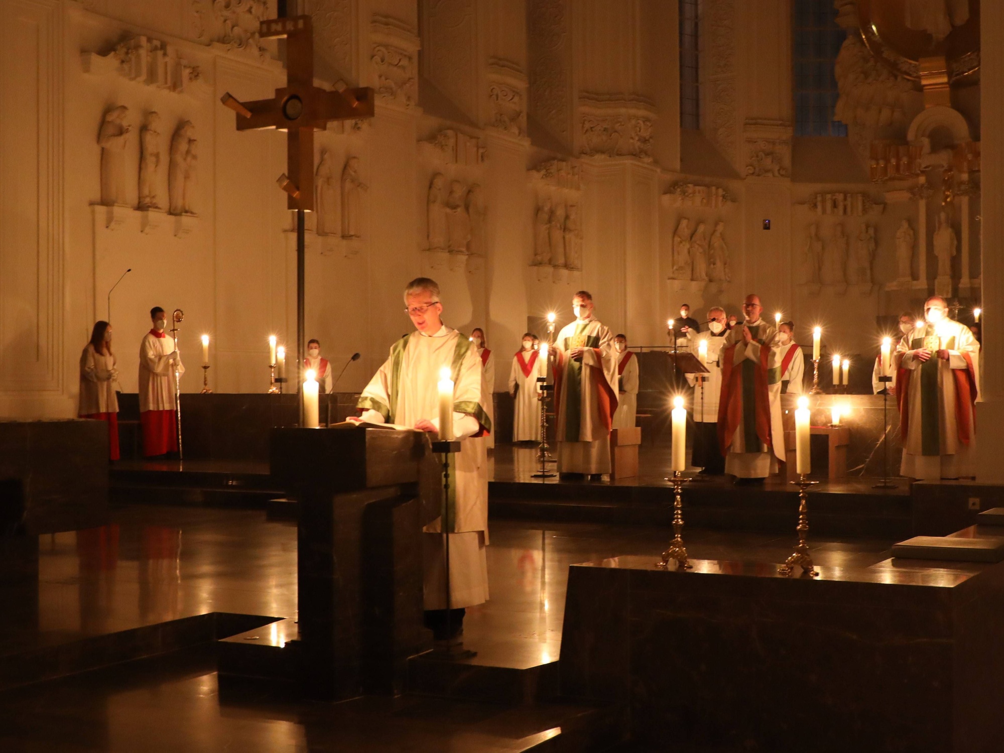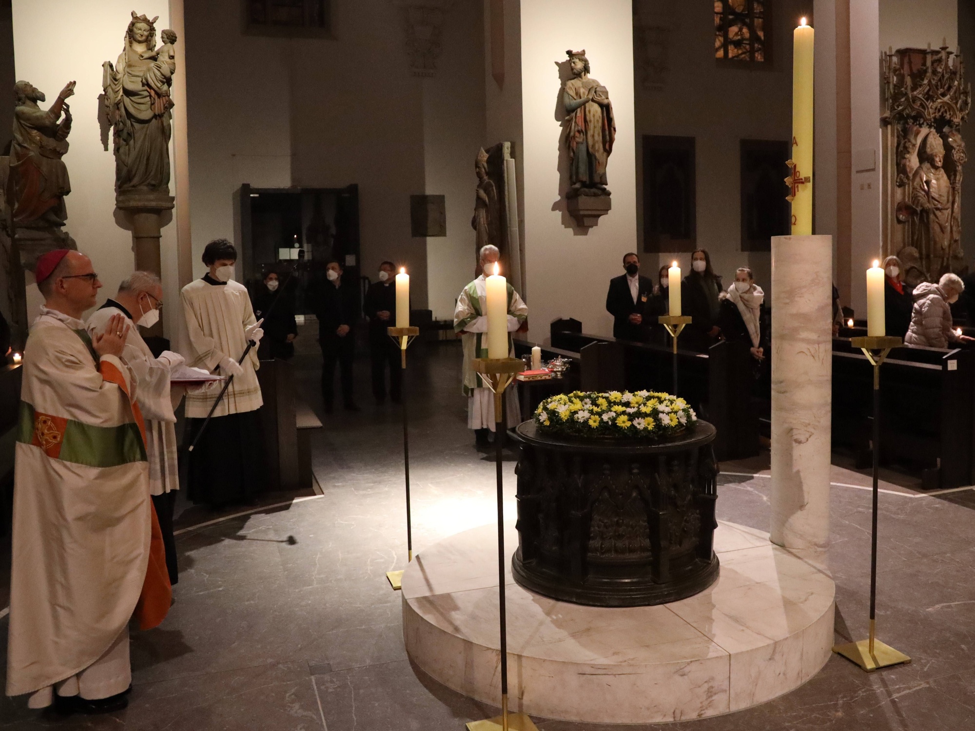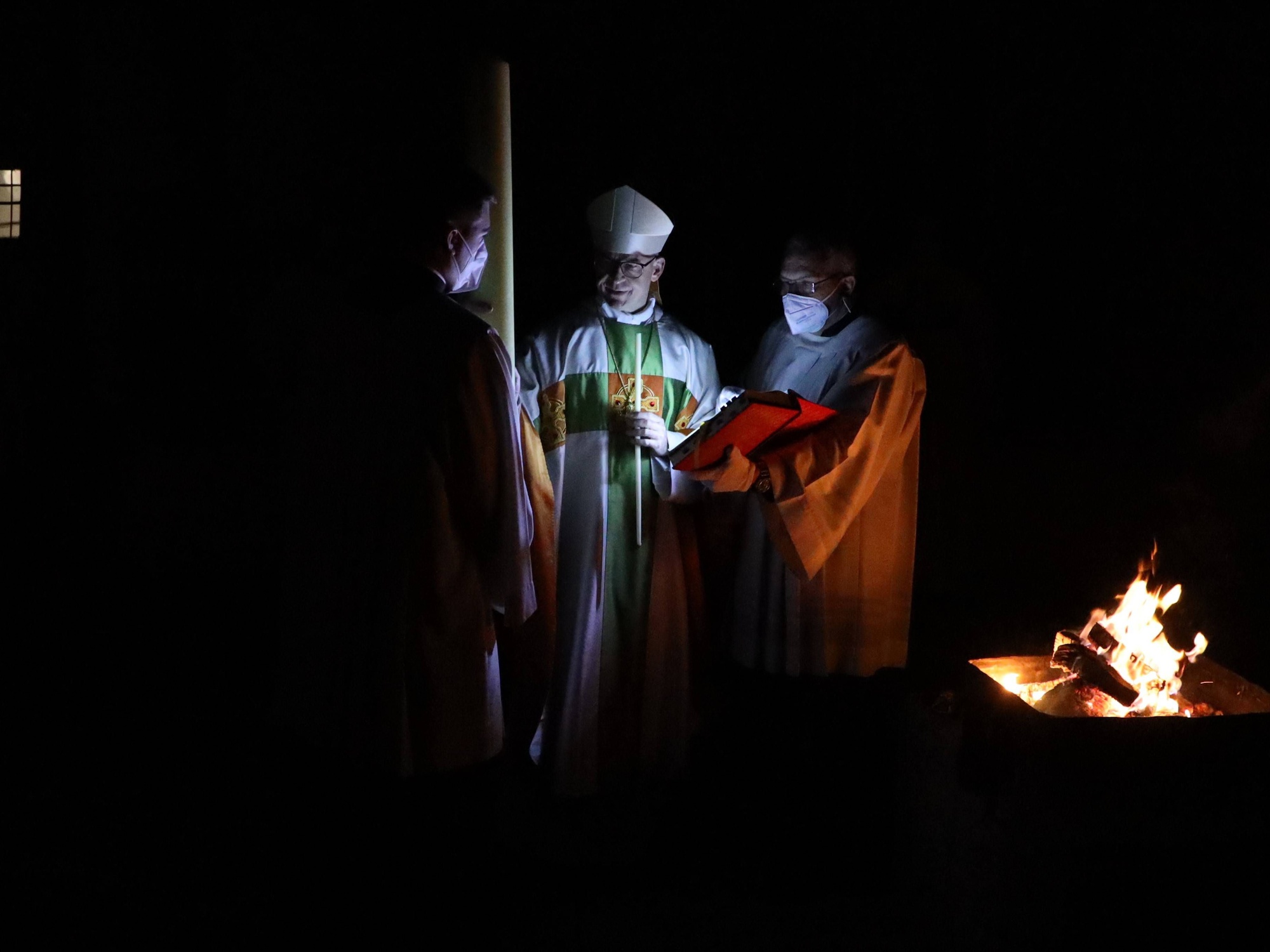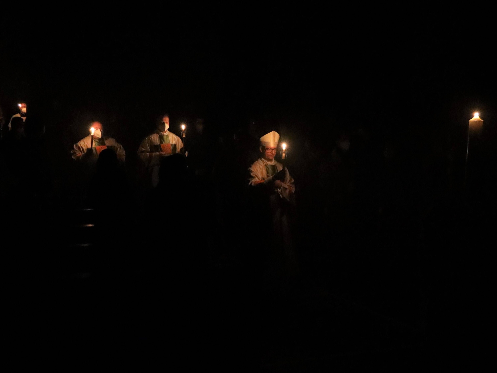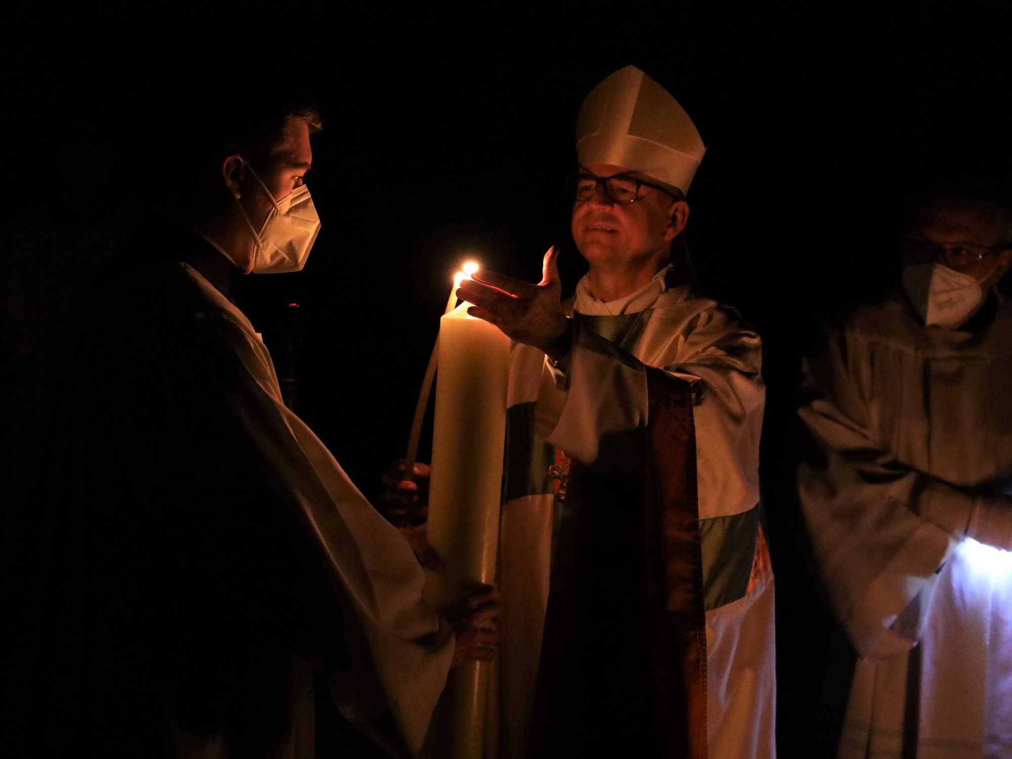 Die Feier der Osternacht begann am Feuer im Domkreuzgang. Nach der Segnung des Osterfeuers entzündete Bischof Jung die große Osterkerze an den Flammen mit den Worten: „Christus ist glorreich auferstanden vom Tod. Sein Licht vertreibe das Dunkel der Herzen.“ Danach wurde das Osterlicht in Begleitung von Mitgliedern des Domkapitels in den dunklen Kiliansdom getragen und an die Gläubigen weitergereicht. Während der Lichtfeier sang Diakon Dr. Martin Faatz das österliche Exsultet, den Lobgesang auf die Osterkerze. Lektoren trugen Lesungen aus dem Alten Testament vor. Beim Gloria läuteten die Glocken des Domes nach den stillen Tagen seit Gründonnerstag wieder. Lesung und Evangelium des Neuen Testaments berichteten von der Auferstehung Jesu. Der Lichtfeier schlossen sich die Taufe Wegels, die allgemeine Tauferneuerung und die Eucharistiefeier an. Den musikalischen Rahmen gestaltete neben Domorganist Professor Stefan Schmidt ein Ensemble der Mädchenkantorei unter der Leitung von Domkantor Alexander Rüth mit „Antwortgesängen zur Osternacht“ von Otmar Faulstich und Alexander Rüth, „Surrexit pastor bonus“ von Felix Mendelssohn Bartholdy und „O filii et filiae“ aus dem Oratorium Christus von Franz Liszt.