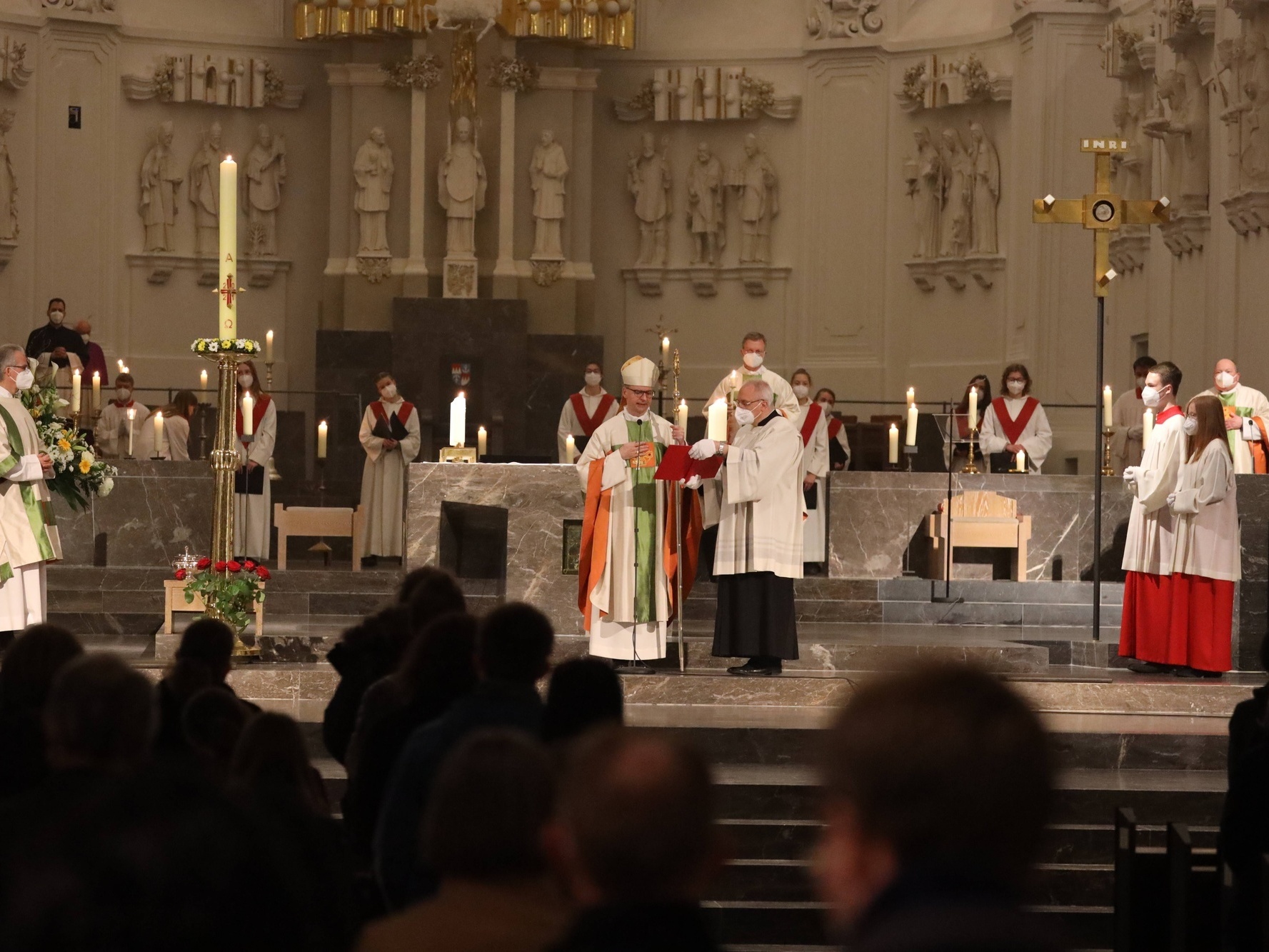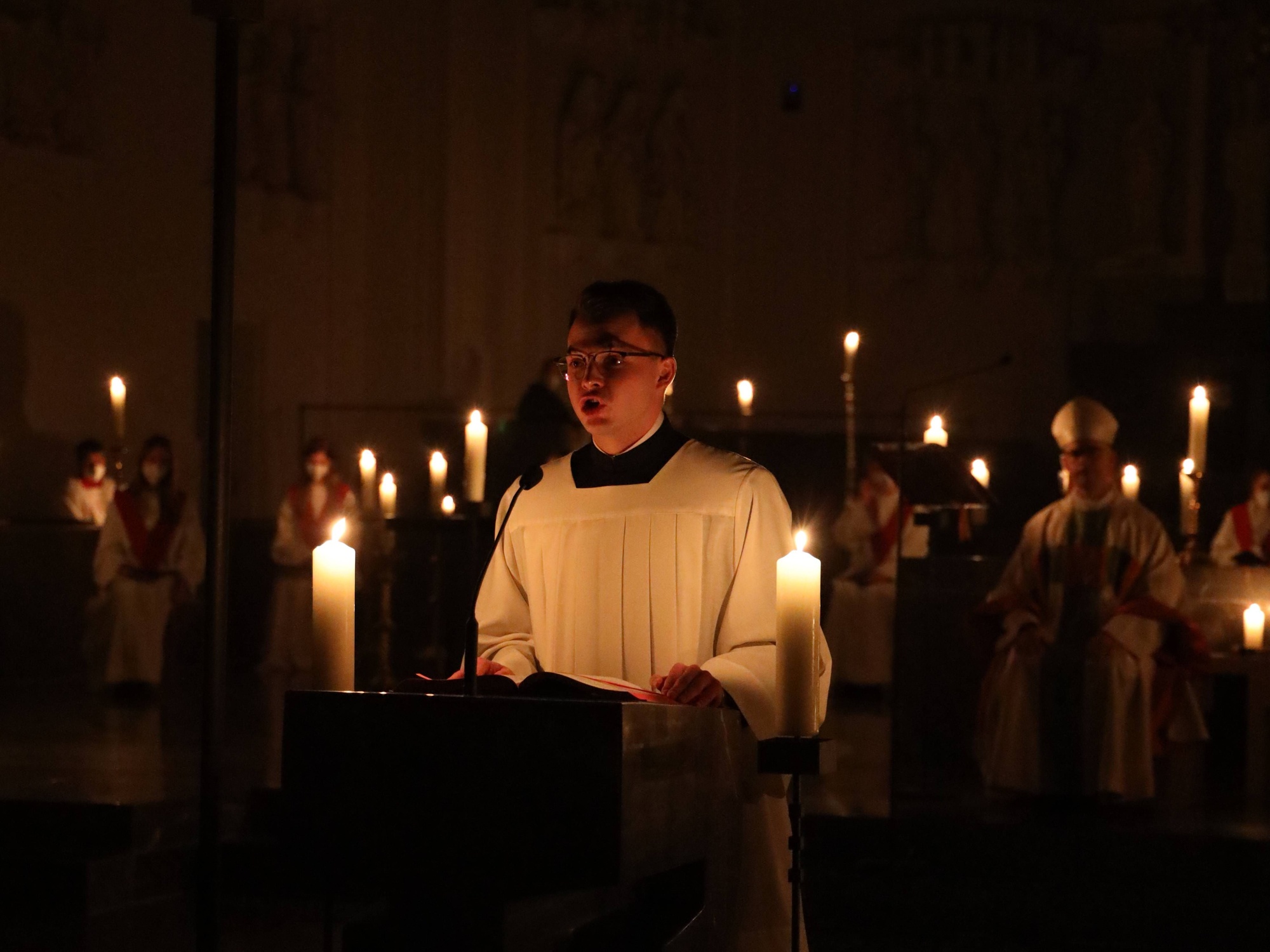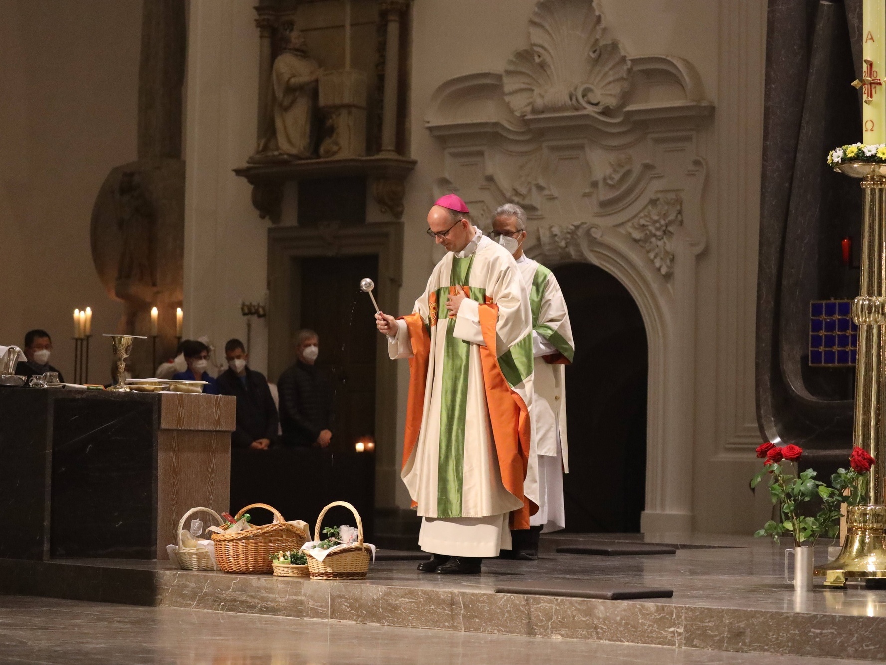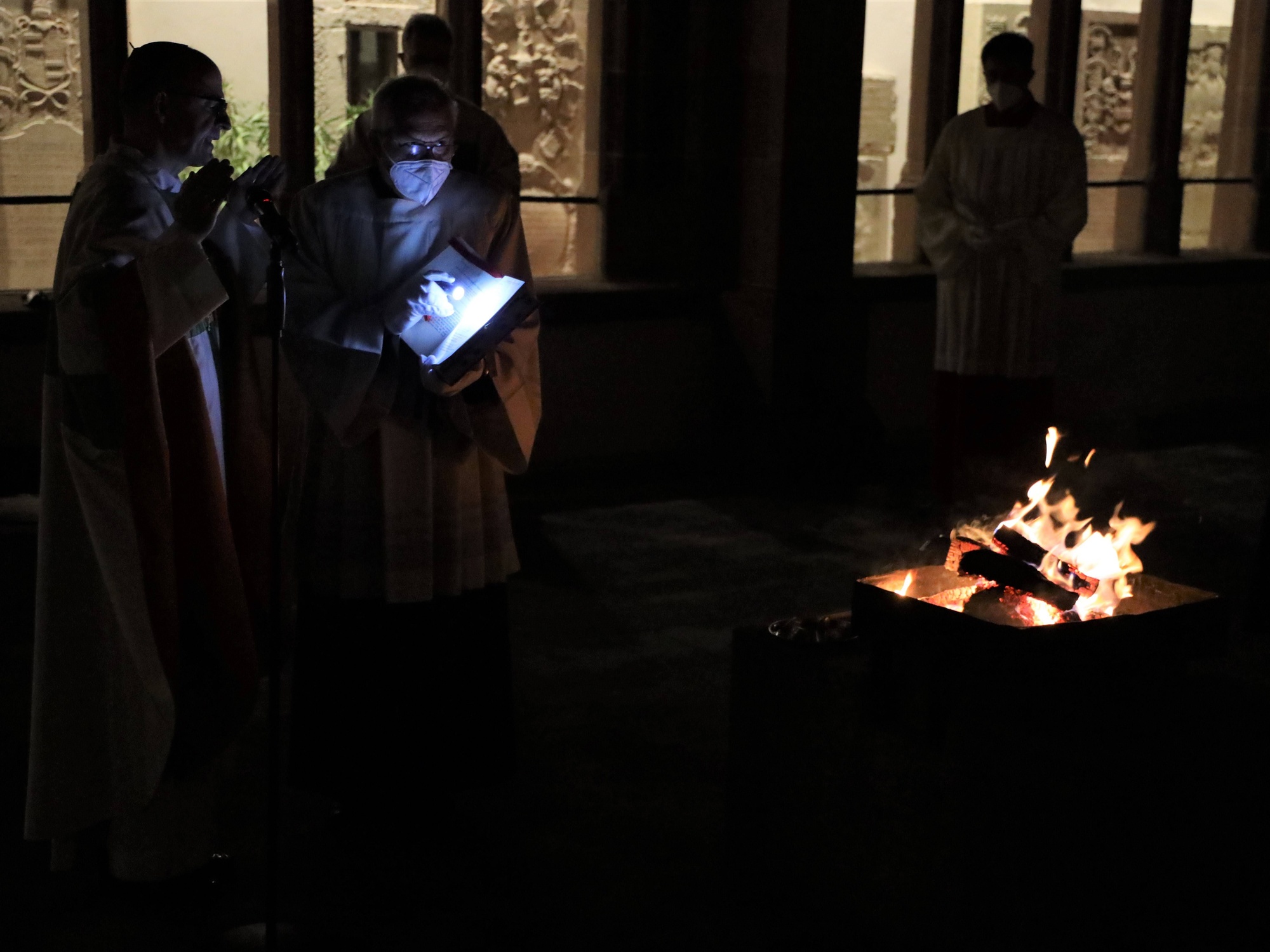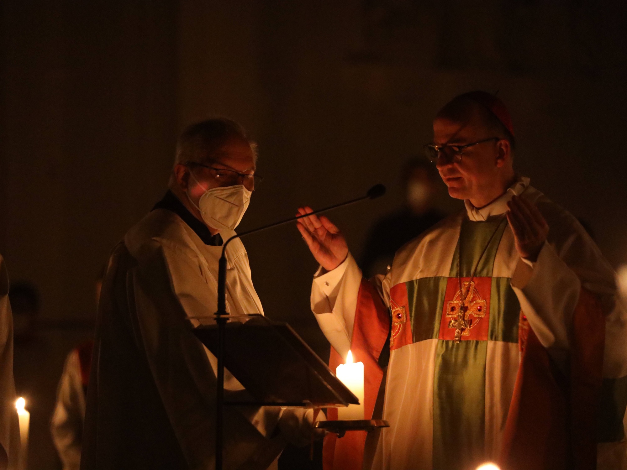 Die Feier der Osternacht begann am Feuer im Domkreuzgang. Nach der Segnung des Osterfeuers entzündete Bischof Jung die große Osterkerze an den Flammen mit den Worten: „Christus ist glorreich auferstanden vom Tod. Sein Licht vertreibe das Dunkel der Herzen.“ Danach wurde das Osterlicht in Begleitung von Mitgliedern des Domkapitels in den dunklen Kiliansdom getragen und an die Gläubigen weitergereicht. Während der Lichtfeier sang Diakon Dr. Martin Faatz das österliche Exsultet, den Lobgesang auf die Osterkerze. Lektoren trugen Lesungen aus dem Alten Testament vor. Beim Gloria läuteten die Glocken des Domes nach den stillen Tagen seit Gründonnerstag wieder. Lesung und Evangelium des Neuen Testaments berichteten von der Auferstehung Jesu. Der Lichtfeier schlossen sich die Taufe Wegels, die allgemeine Tauferneuerung und die Eucharistiefeier an. Den musikalischen Rahmen gestaltete neben Domorganist Professor Stefan Schmidt ein Ensemble der Mädchenkantorei unter der Leitung von Domkantor Alexander Rüth mit „Antwortgesängen zur Osternacht“ von Otmar Faulstich und Alexander Rüth, „Surrexit pastor bonus“ von Felix Mendelssohn Bartholdy und „O filii et filiae“ aus dem Oratorium Christus von Franz Liszt.