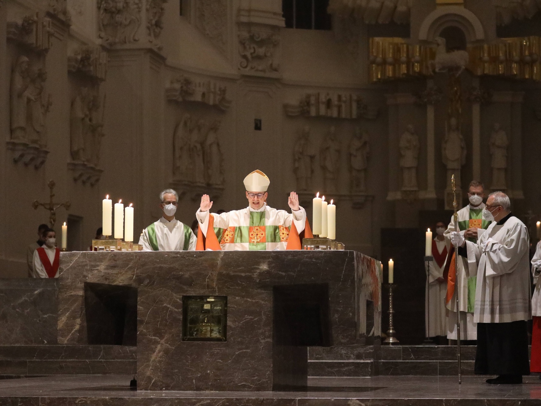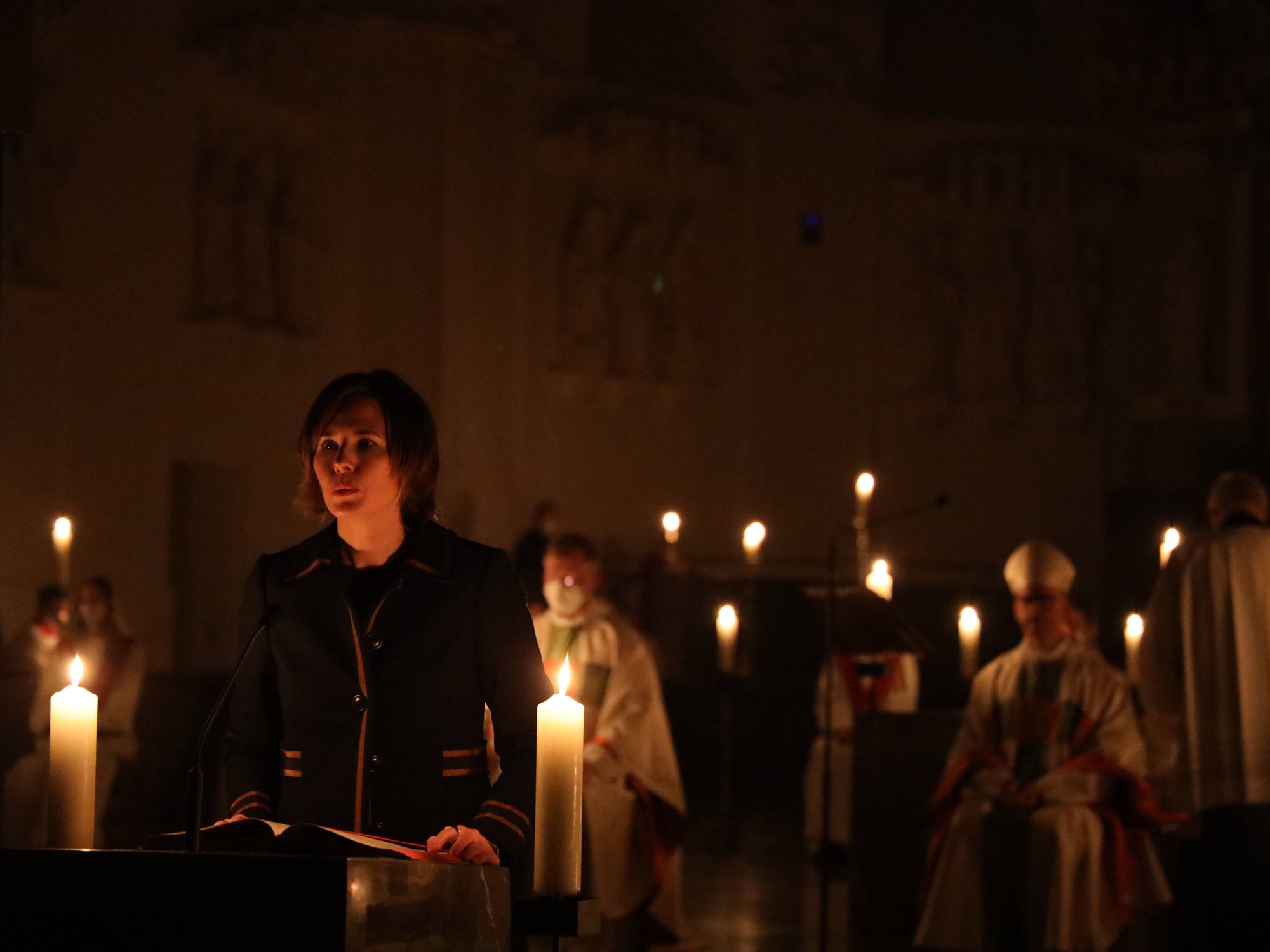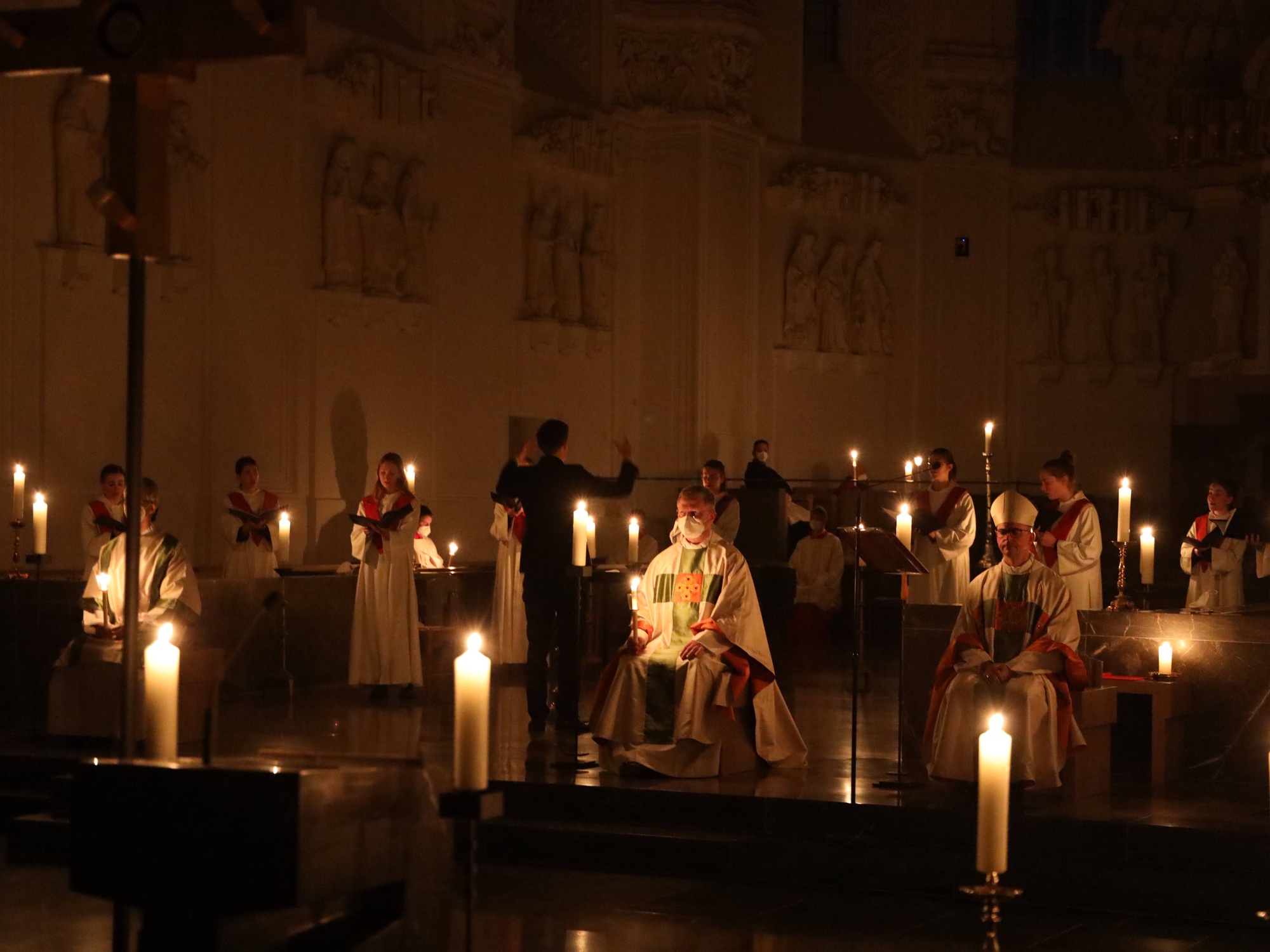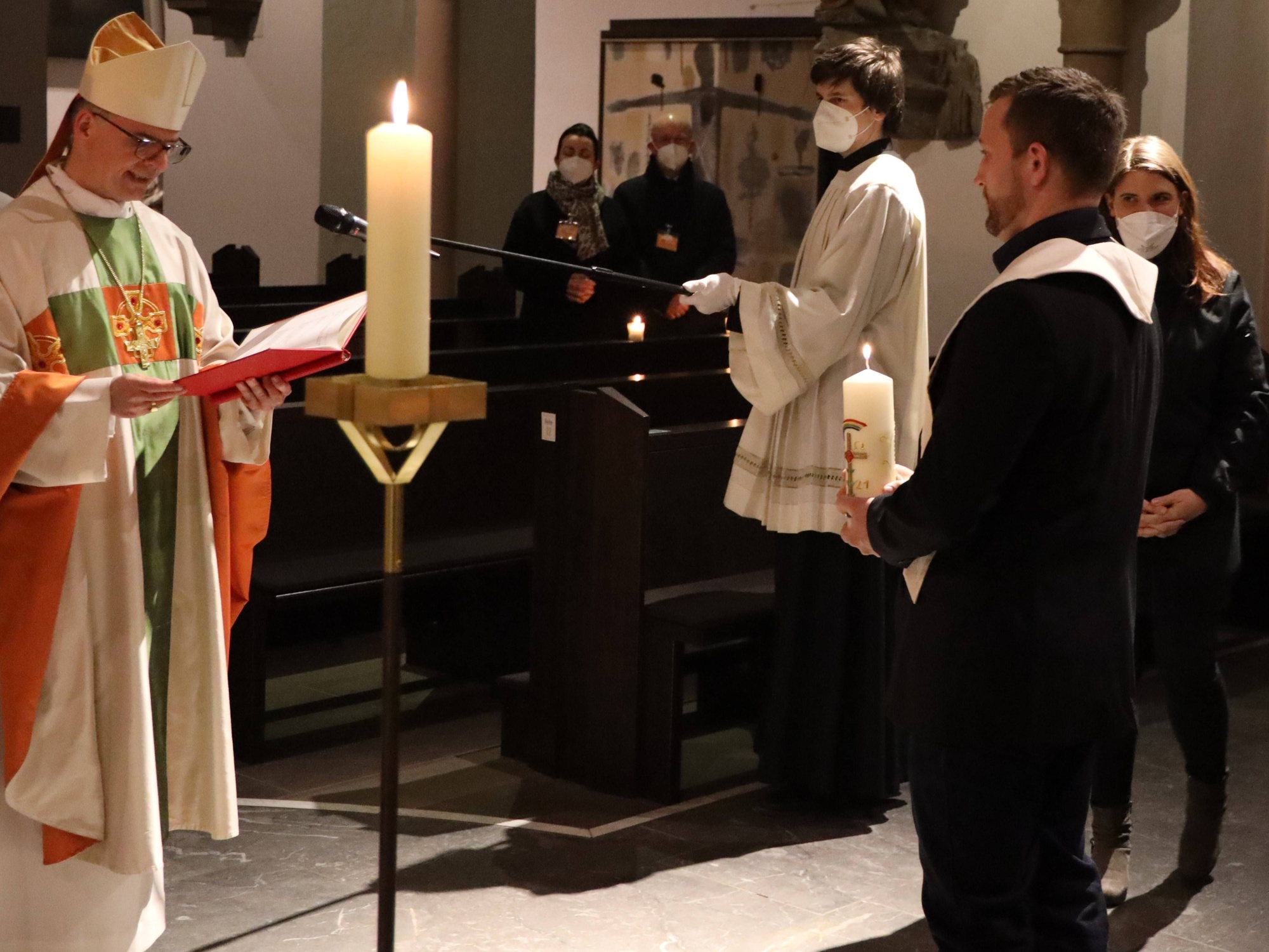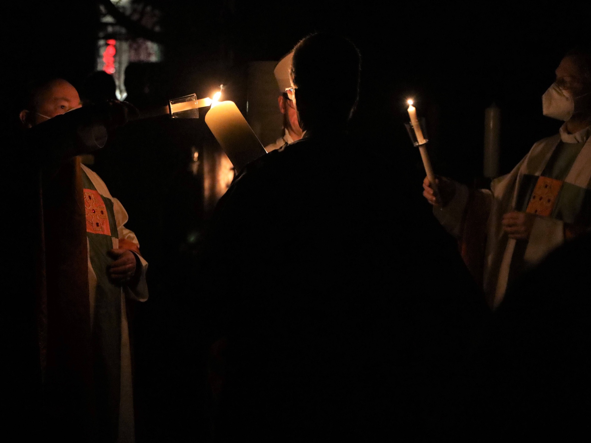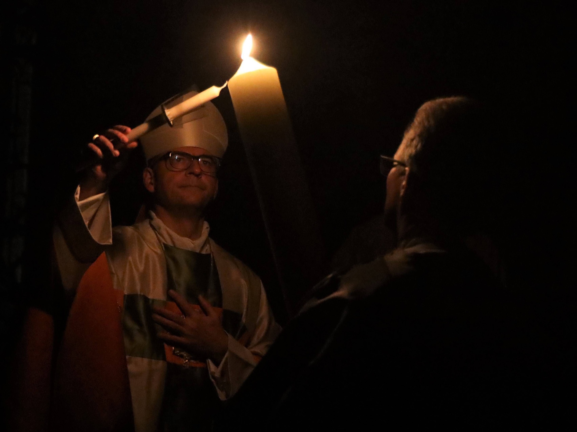 Die Feier der Osternacht begann am Feuer im Domkreuzgang. Nach der Segnung des Osterfeuers entzündete Bischof Jung die große Osterkerze an den Flammen mit den Worten: „Christus ist glorreich auferstanden vom Tod. Sein Licht vertreibe das Dunkel der Herzen.“ Danach wurde das Osterlicht in Begleitung von Mitgliedern des Domkapitels in den dunklen Kiliansdom getragen und an die Gläubigen weitergereicht. Während der Lichtfeier sang Diakon Dr. Martin Faatz das österliche Exsultet, den Lobgesang auf die Osterkerze. Lektoren trugen Lesungen aus dem Alten Testament vor. Beim Gloria läuteten die Glocken des Domes nach den stillen Tagen seit Gründonnerstag wieder. Lesung und Evangelium des Neuen Testaments berichteten von der Auferstehung Jesu. Der Lichtfeier schlossen sich die Taufe Wegels, die allgemeine Tauferneuerung und die Eucharistiefeier an. Den musikalischen Rahmen gestaltete neben Domorganist Professor Stefan Schmidt ein Ensemble der Mädchenkantorei unter der Leitung von Domkantor Alexander Rüth mit „Antwortgesängen zur Osternacht“ von Otmar Faulstich und Alexander Rüth, „Surrexit pastor bonus“ von Felix Mendelssohn Bartholdy und „O filii et filiae“ aus dem Oratorium Christus von Franz Liszt.