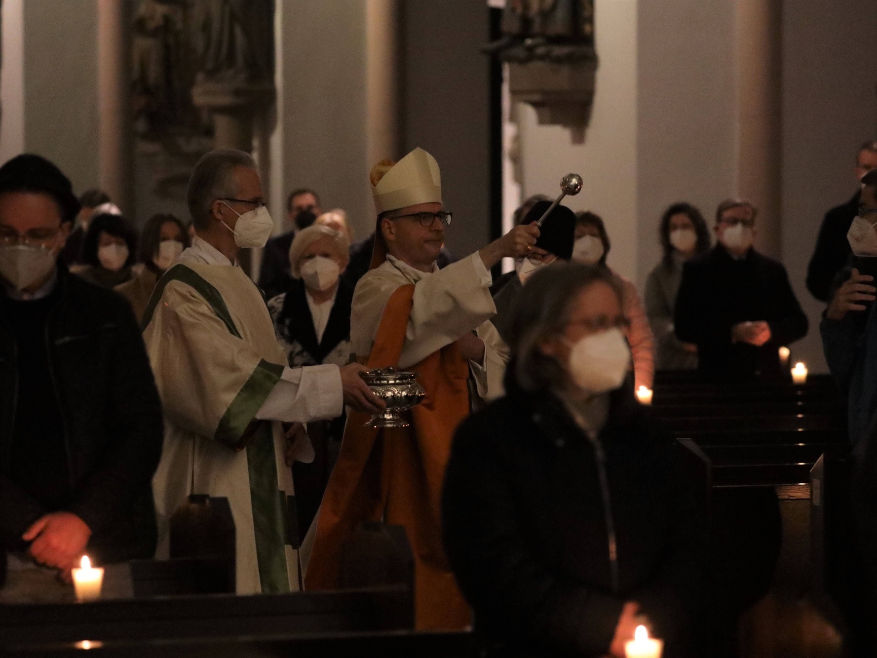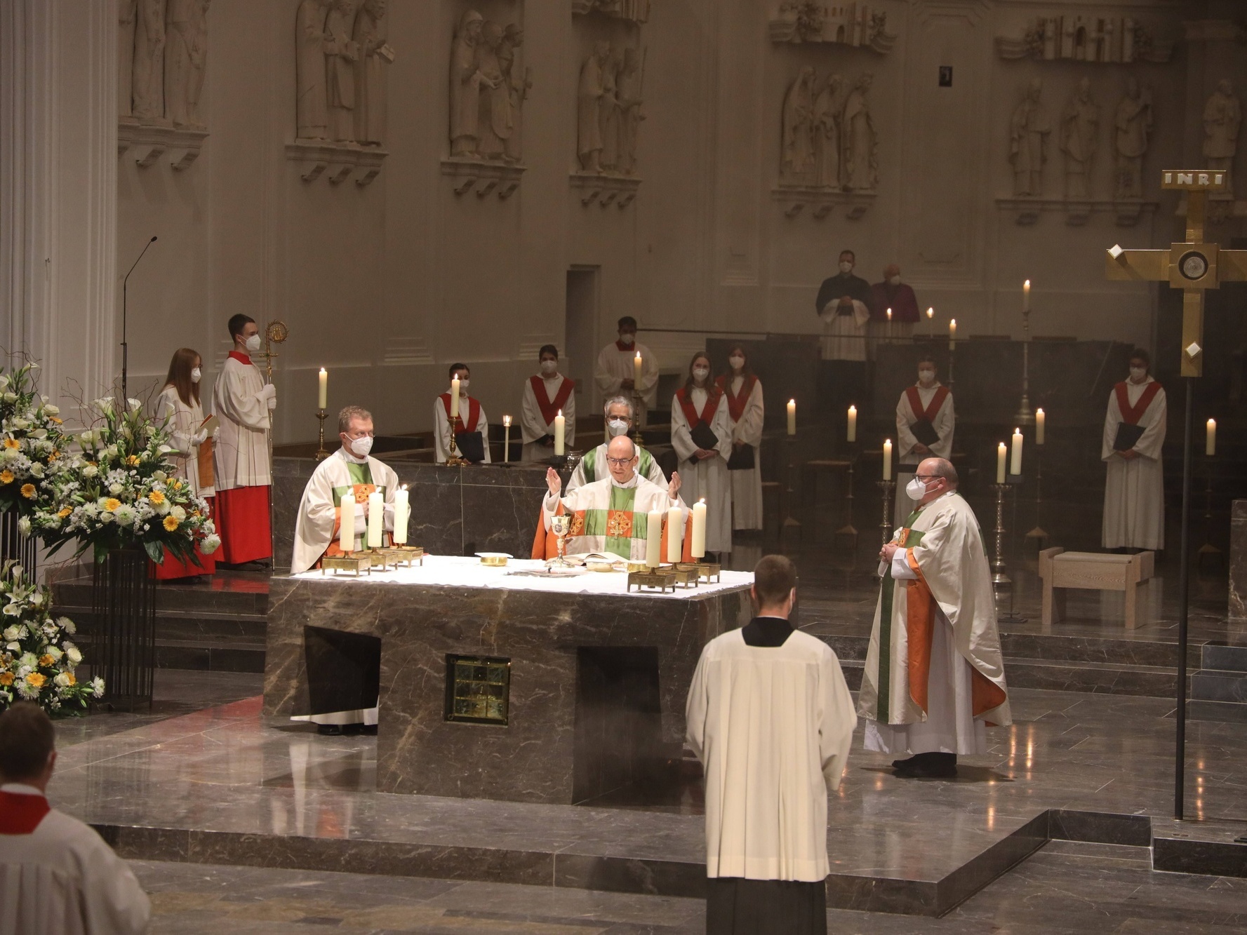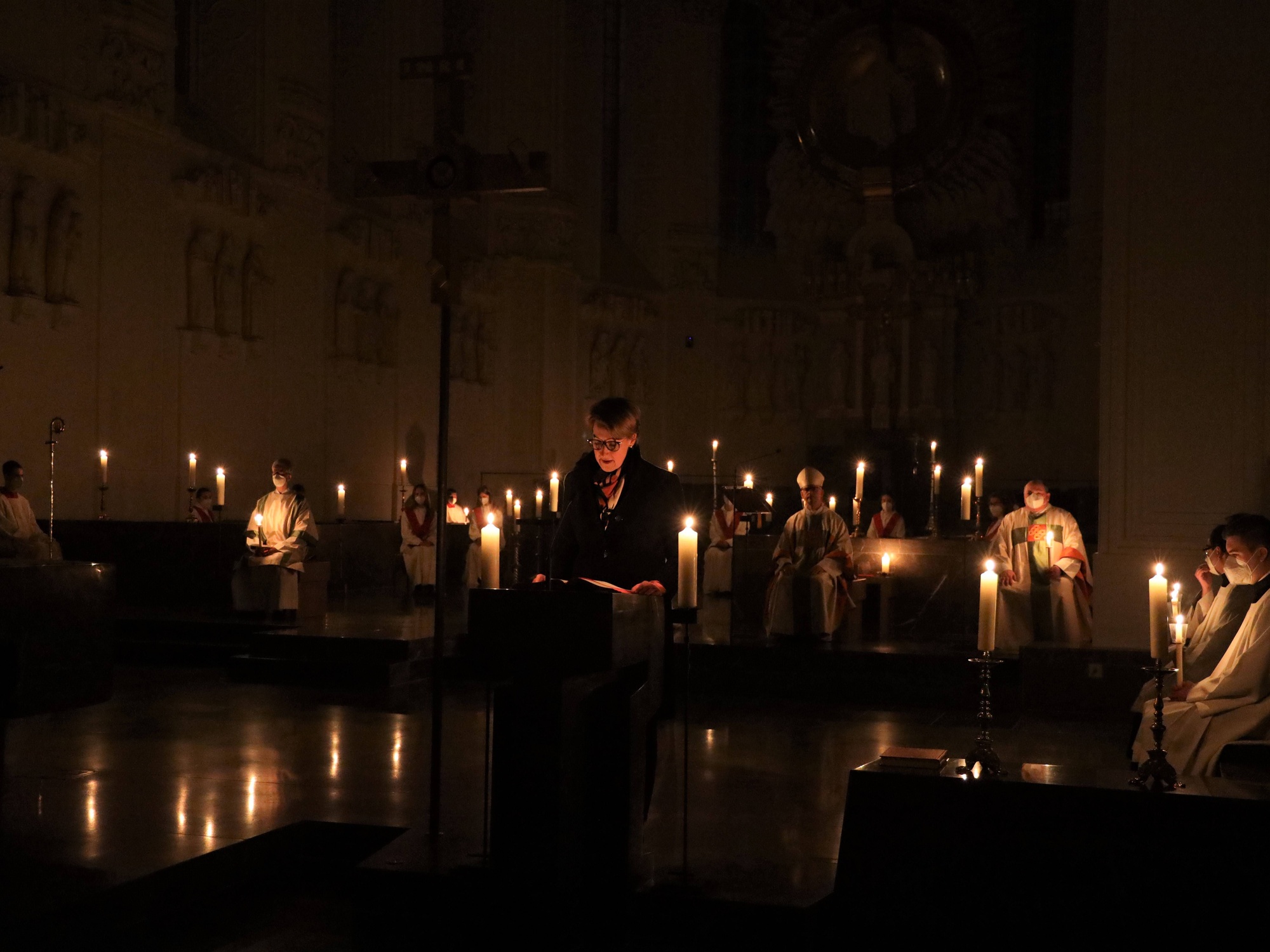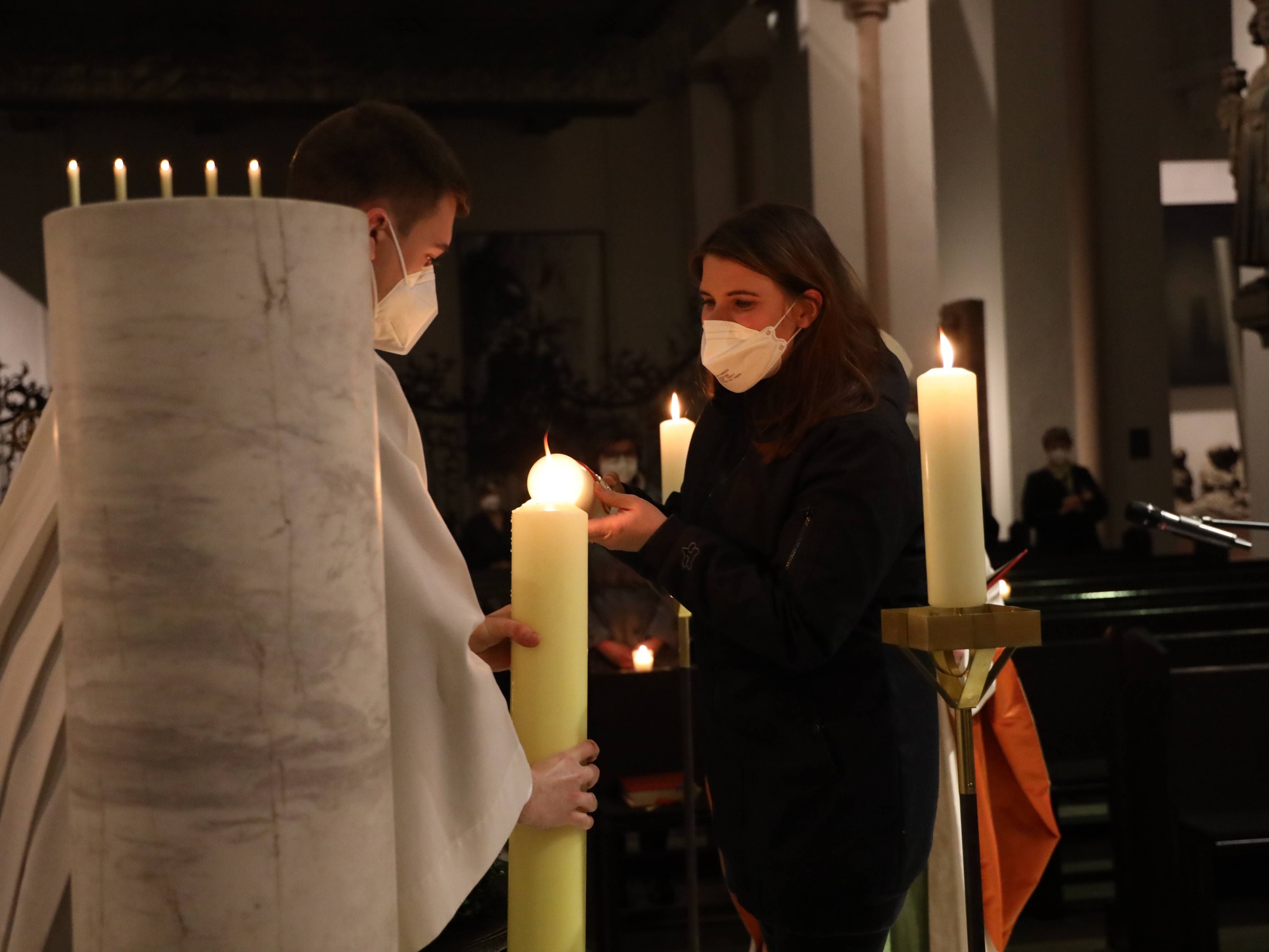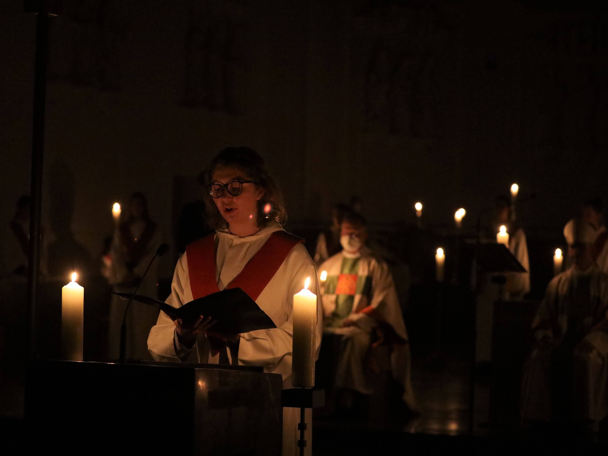 Die Feier der Osternacht begann am Feuer im Domkreuzgang. Nach der Segnung des Osterfeuers entzündete Bischof Jung die große Osterkerze an den Flammen mit den Worten: „Christus ist glorreich auferstanden vom Tod. Sein Licht vertreibe das Dunkel der Herzen.“ Danach wurde das Osterlicht in Begleitung von Mitgliedern des Domkapitels in den dunklen Kiliansdom getragen und an die Gläubigen weitergereicht. Während der Lichtfeier sang Diakon Dr. Martin Faatz das österliche Exsultet, den Lobgesang auf die Osterkerze. Lektoren trugen Lesungen aus dem Alten Testament vor. Beim Gloria läuteten die Glocken des Domes nach den stillen Tagen seit Gründonnerstag wieder. Lesung und Evangelium des Neuen Testaments berichteten von der Auferstehung Jesu. Der Lichtfeier schlossen sich die Taufe Wegels, die allgemeine Tauferneuerung und die Eucharistiefeier an. Den musikalischen Rahmen gestaltete neben Domorganist Professor Stefan Schmidt ein Ensemble der Mädchenkantorei unter der Leitung von Domkantor Alexander Rüth mit „Antwortgesängen zur Osternacht“ von Otmar Faulstich und Alexander Rüth, „Surrexit pastor bonus“ von Felix Mendelssohn Bartholdy und „O filii et filiae“ aus dem Oratorium Christus von Franz Liszt.