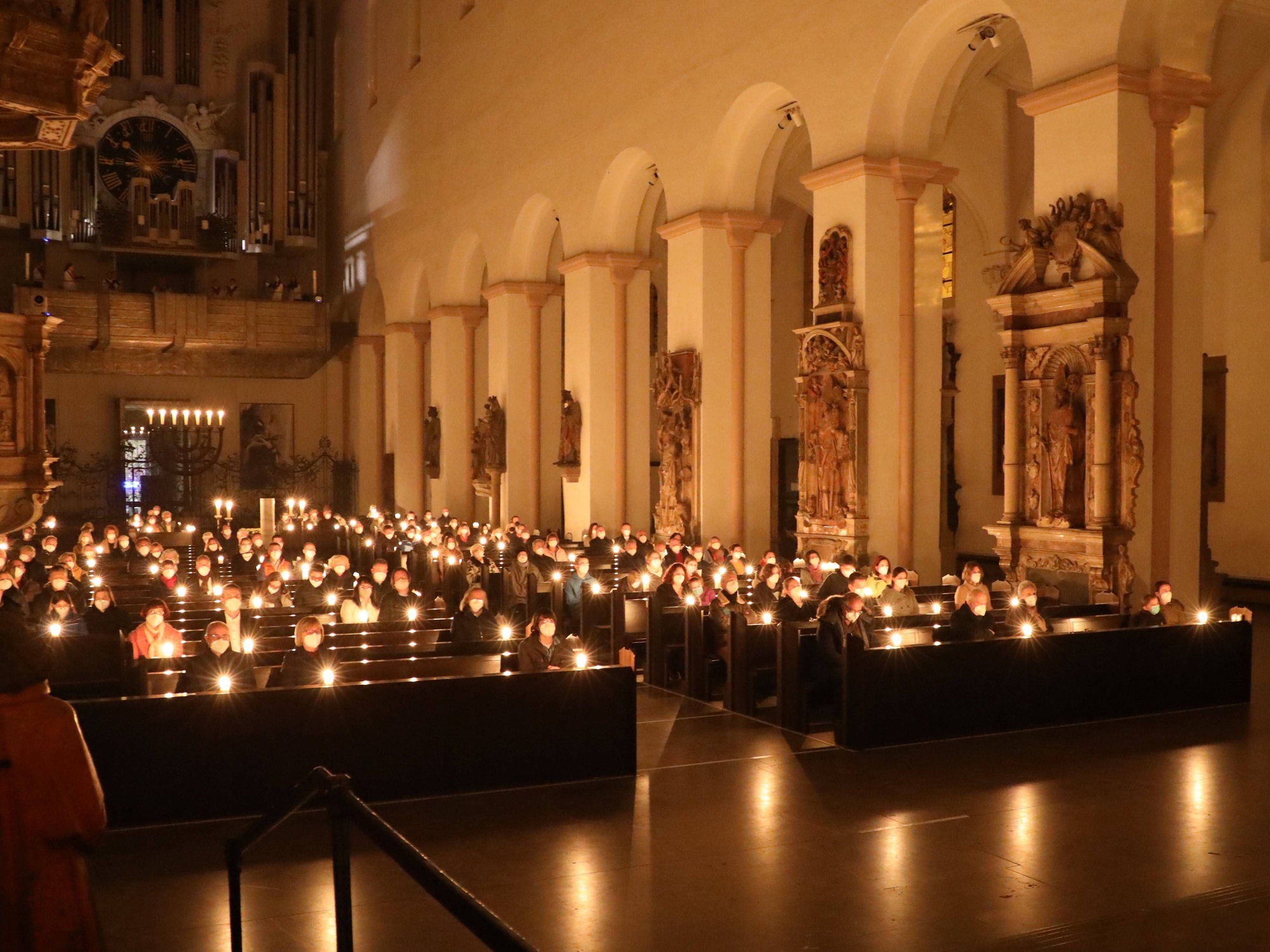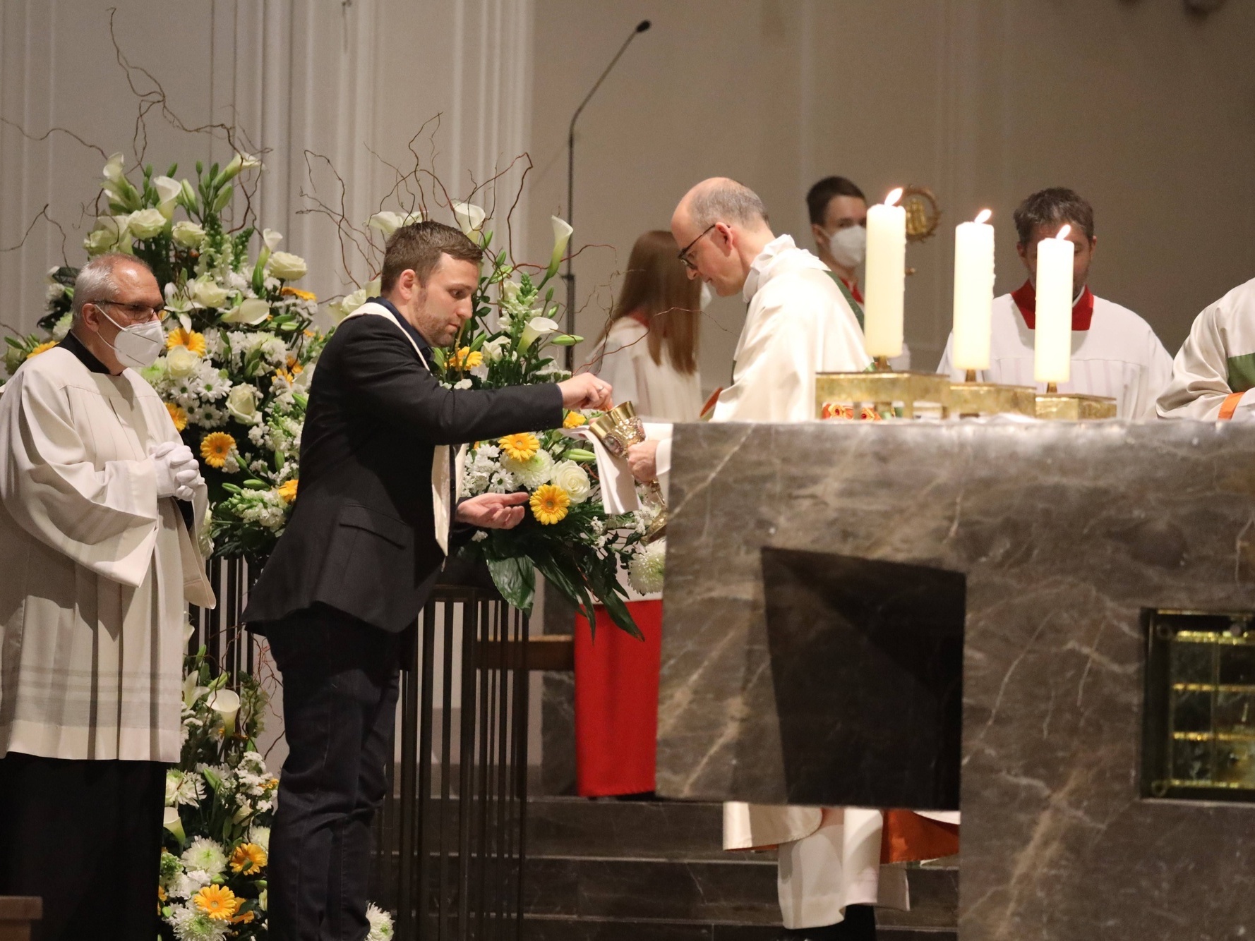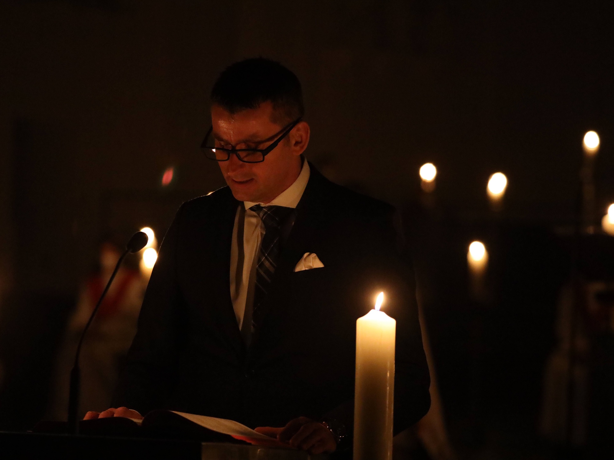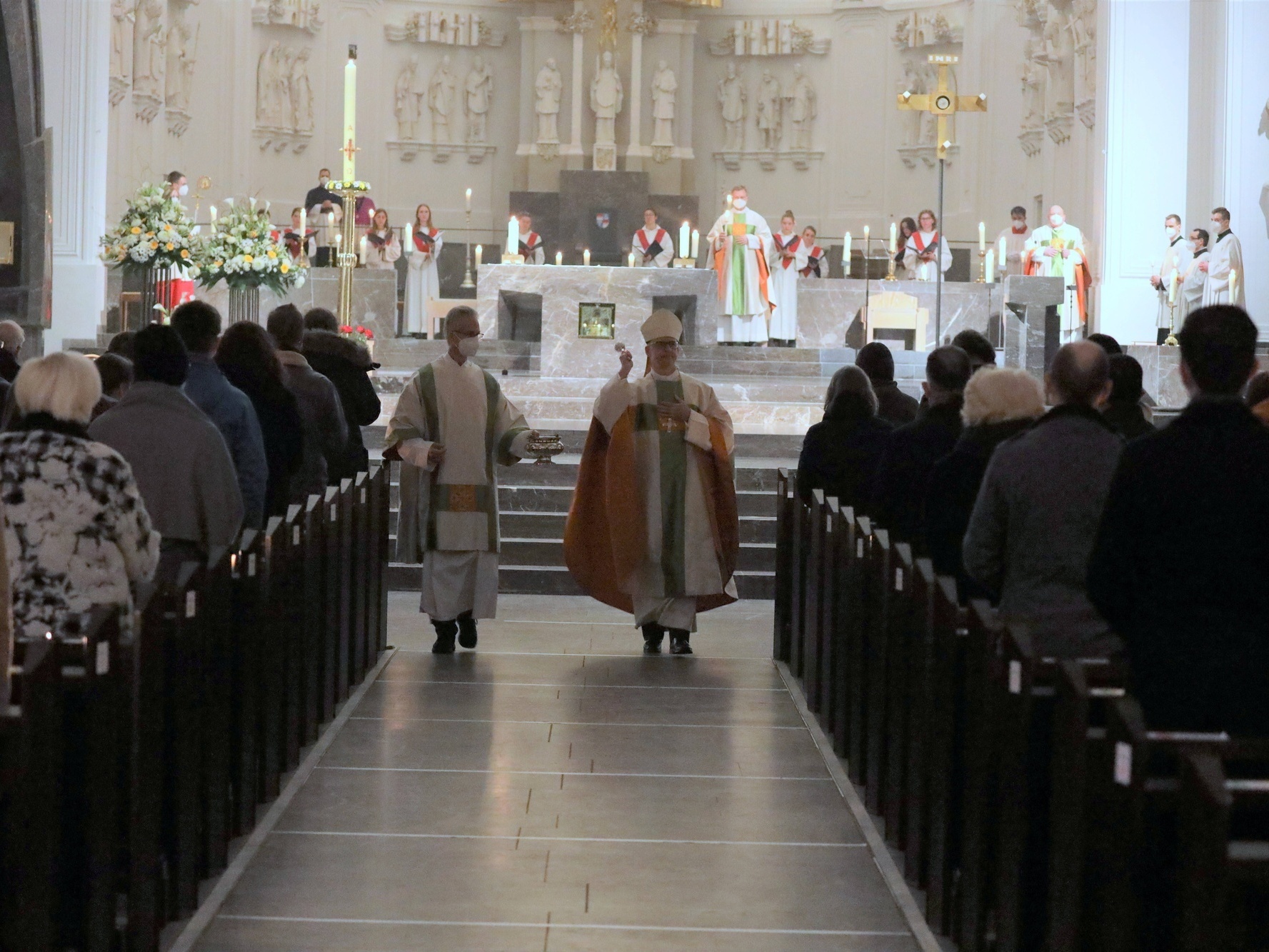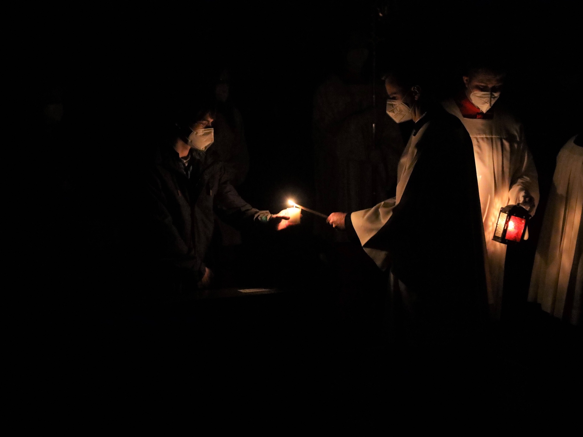 Die Feier der Osternacht begann am Feuer im Domkreuzgang. Nach der Segnung des Osterfeuers entzündete Bischof Jung die große Osterkerze an den Flammen mit den Worten: „Christus ist glorreich auferstanden vom Tod. Sein Licht vertreibe das Dunkel der Herzen.“ Danach wurde das Osterlicht in Begleitung von Mitgliedern des Domkapitels in den dunklen Kiliansdom getragen und an die Gläubigen weitergereicht. Während der Lichtfeier sang Diakon Dr. Martin Faatz das österliche Exsultet, den Lobgesang auf die Osterkerze. Lektoren trugen Lesungen aus dem Alten Testament vor. Beim Gloria läuteten die Glocken des Domes nach den stillen Tagen seit Gründonnerstag wieder. Lesung und Evangelium des Neuen Testaments berichteten von der Auferstehung Jesu. Der Lichtfeier schlossen sich die Taufe Wegels, die allgemeine Tauferneuerung und die Eucharistiefeier an. Den musikalischen Rahmen gestaltete neben Domorganist Professor Stefan Schmidt ein Ensemble der Mädchenkantorei unter der Leitung von Domkantor Alexander Rüth mit „Antwortgesängen zur Osternacht“ von Otmar Faulstich und Alexander Rüth, „Surrexit pastor bonus“ von Felix Mendelssohn Bartholdy und „O filii et filiae“ aus dem Oratorium Christus von Franz Liszt.