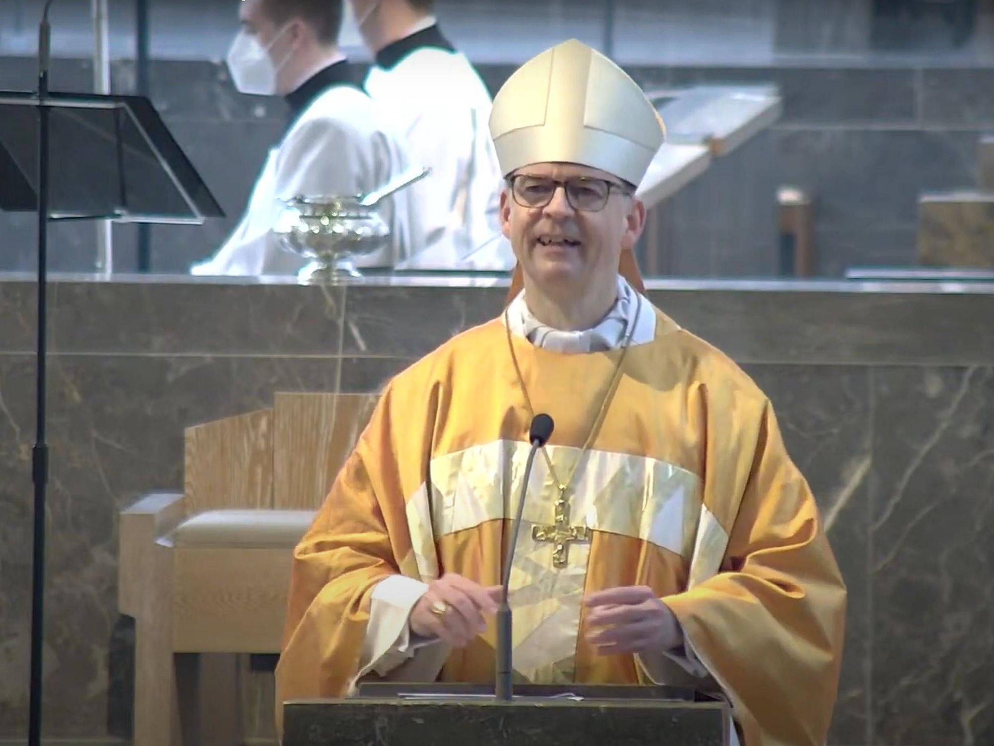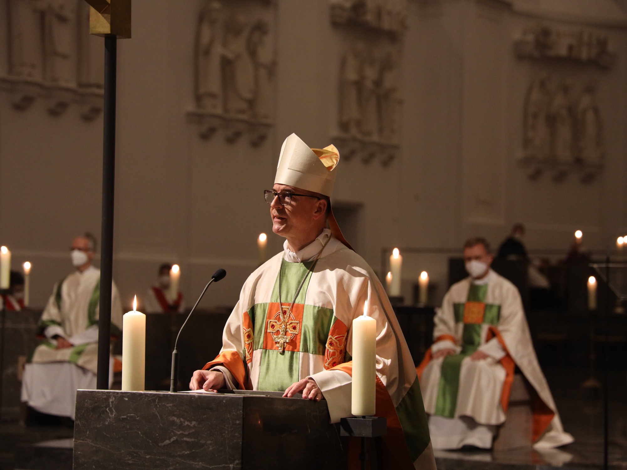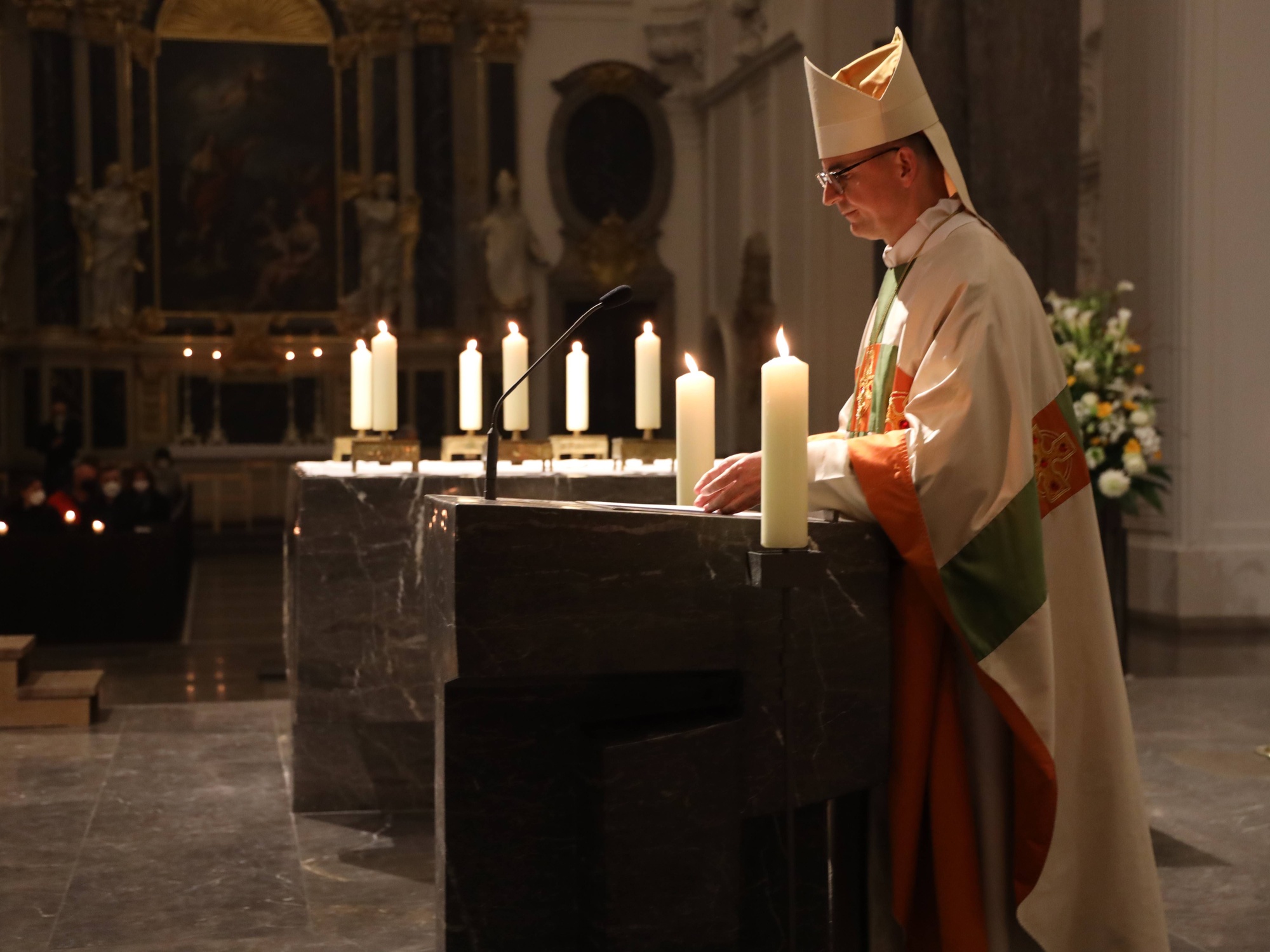 In der Osternacht deutete Bischof Jung in der Predigt einen Vers aus dem alttestamentlichen Buch Ezechiel. Darin ist davon die Rede, dass Gott den Menschen das Herz aus Stein durch eines aus Fleisch ersetze. „Mitten im Exil in Babylon darf der Prophet Ezechiel seinem Volk dieses wunderbare Wort des Heils zusagen.“ Statt Gefühllosigkeit und Herzenskälte schenke er seinem Volk ein einfühlsames und mitfühlendes Herz. Statt mit Bitterkeit und Gleichgültigkeit erfülle er die Herzen mit neuer Lebensfreude und neuem Willen, die gemeinsame Zukunft zu gestalten. Dem Propheten ist nach den Worten des Bischofs klargeworden, dass das Exil und die Verbannung nach Babylon nicht allein die Folge einer militärischen Niederlage oder einer verfehlten Politik gewesen sind. „Das Exil hatte schon lange vorher begonnen.“ Seinen Anfang habe es genommen, als sich das Volk im Herzen von Gott abgewandt habe. „Mit dem Verlust der inneren Stabilität war der äußere Zusammenbruch nur noch eine Frage der Zeit“, betonte Bischof Jung.