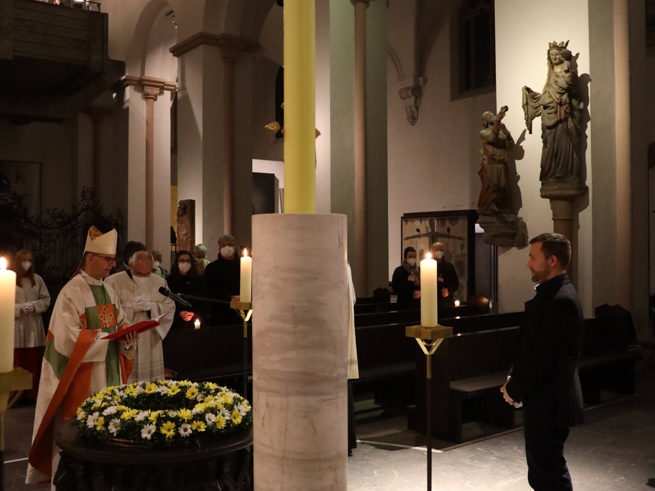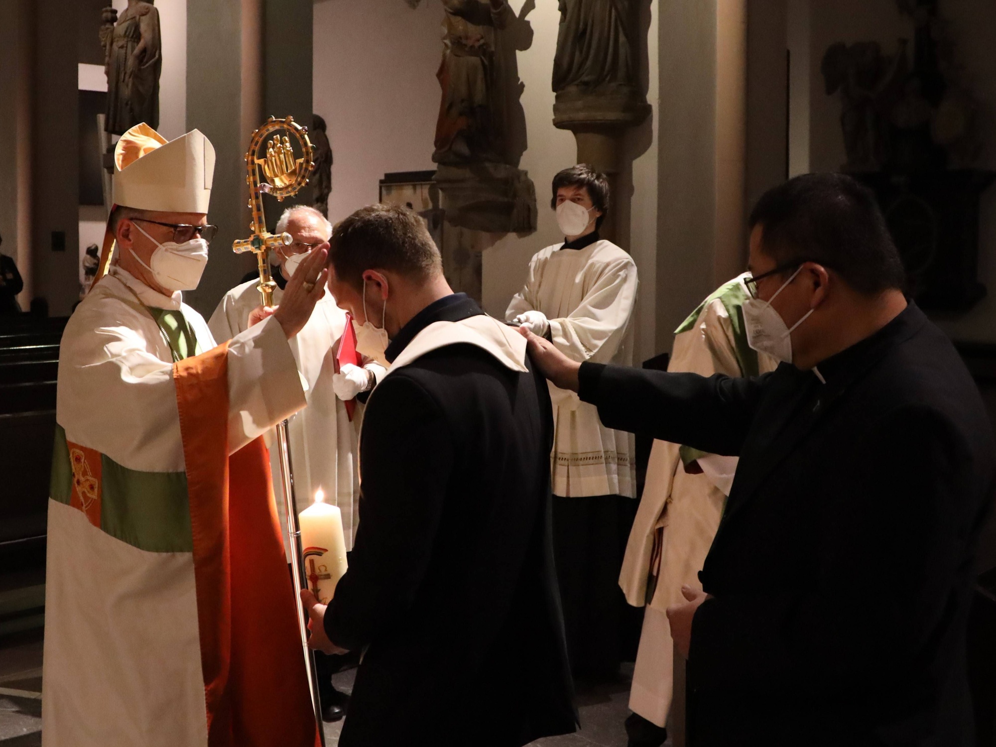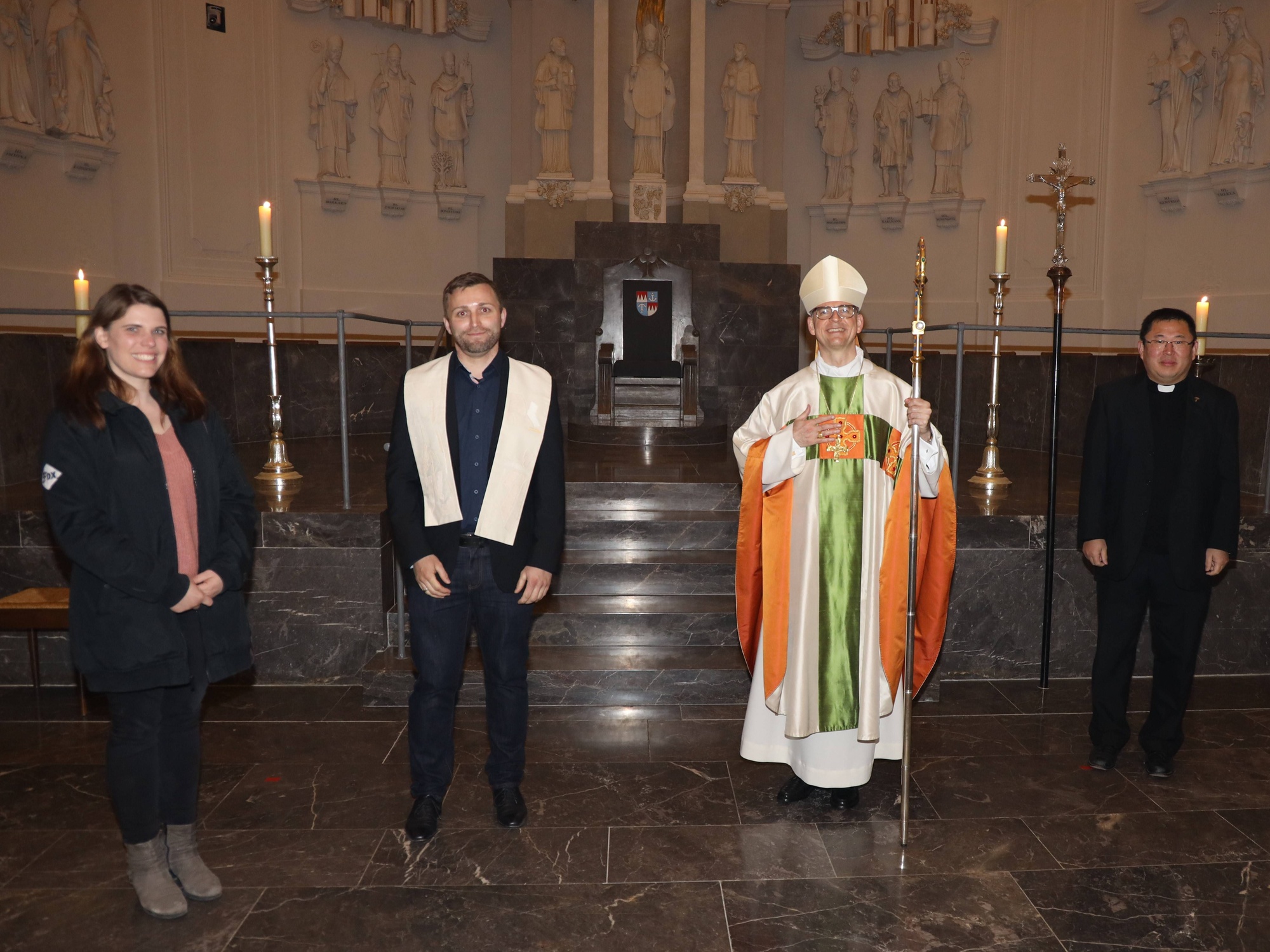 Als eine „wunderbare Herzgeschichte“ bezeichnete der Bischof den Weg von Michael Wegel (32) aus Kothen (Landkreis Bad Kissingen), dem er in der Osternacht die Sakramente von Taufe, Erstkommunion und Firmung spenden durfte. Gott habe sein Herz bekehrt, und zugleich sei es ein großes Gemeinschaftswerk vieler – „der geliebten Ehefrau, einer Gemeinde, die andere offenherzig aufnimmt und mitträgt, eines guten Begleiters wie unseres Diakons Sell, der ‚dranbleibt‘, aber auch der Sehnsucht im eigenen Herzen.“