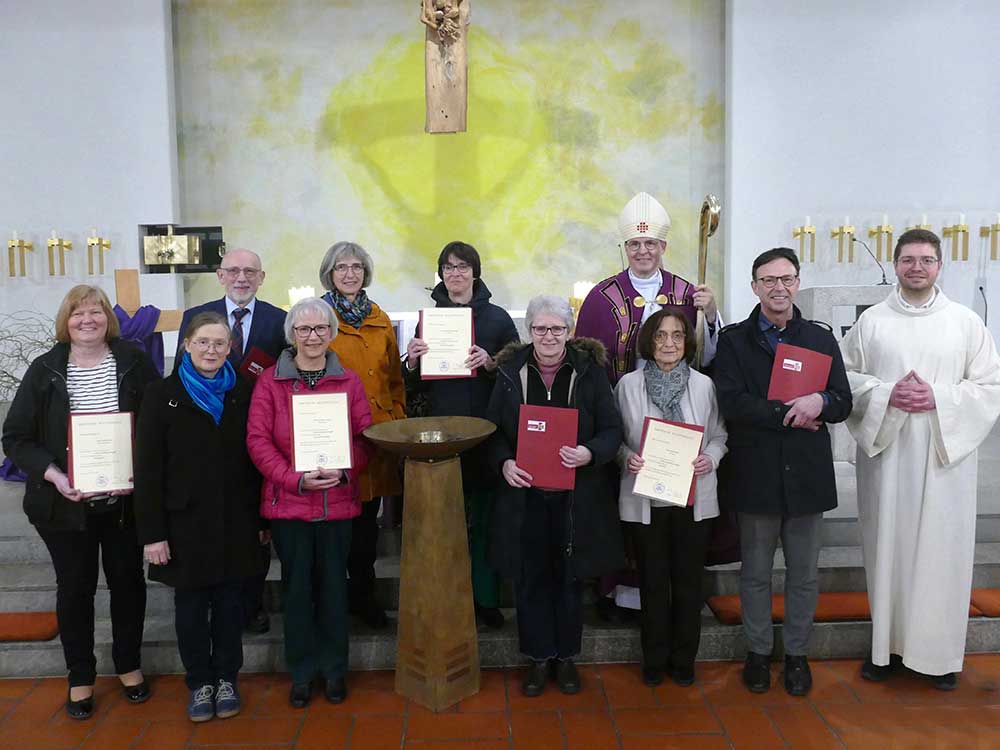 In der Pfarrkirche St. Jakobus. d. Ä., Schimborn hat Weihbischof Paul Reder am Freitag, 3. März 2026, sieben Frauen und zwei Männer als Gottesdienstbeauftragte zum Dienst in ihren Gemeinden beauftragt. Die Urkunde erhielten Andrea Behl (Geiselbach), Bernadette Brehm (Goldbach), Gerhard Dalberg (Aschaffenburg), Annette Freund (Stockstadt), Heike Hahn (Niedersteinbach), Wanda Jung (Aschaffenburg), Herta Röll (Alzenau), Steffen Rosenberger (Schimborn) und Felicitas Tenbrink (Mömbris).