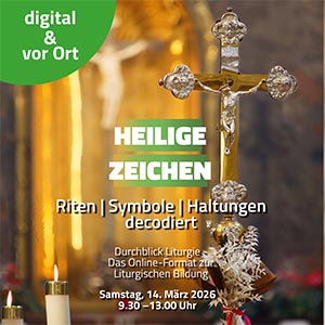 Unter dem Thema "Heilige Zeichen – Riten, Symbole, Handlungen decodiert" findet am Samstag, 14. März 2026 eine Online-Fortbildung statt. Sie kann von Interessentinnen und Interessenten selbst besucht werden. Noch sinnvoller ist allerdings ein gemeinsames Angebot etwa auf Pfarrei- oder Verbandsebene, um einen geistlichen Gewinn für Ihre Gemeinden zu ermöglichen.