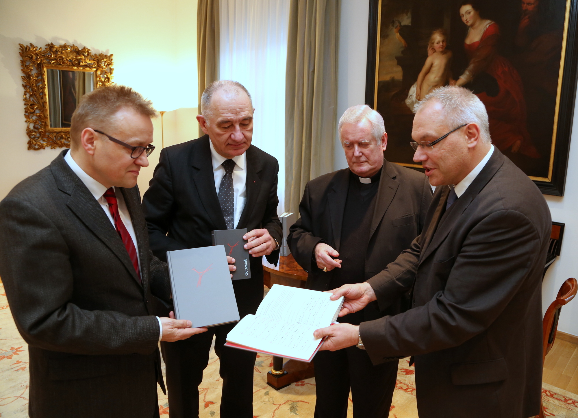 Würzburg (POW) Das Dienstebuch zum neuen katholischen Gebet- und Gesangbuch „Gotteslob“ ist ab sofort im Buchhandel erhältlich. Herausgeber Bischof Dr. Friedhelm Hofmann, Vorsitzender der Liturgiekommission der Deutschen Bischofskonferenz, und die beiden Schriftleiter Professor Dr. Winfried Haunerland (München) und Dr. Stephan Steger (Würzburg) sowie Dr. Andreas Poschmann vom Deutschen Liturgischen Institut in Trier stellten das 281-seitige Werk in Würzburg vor.