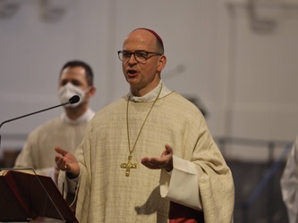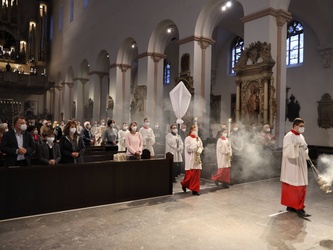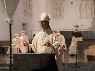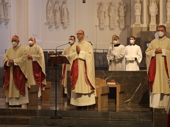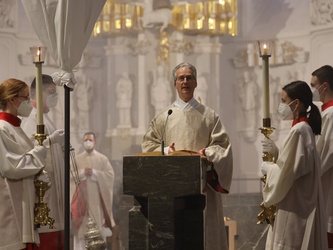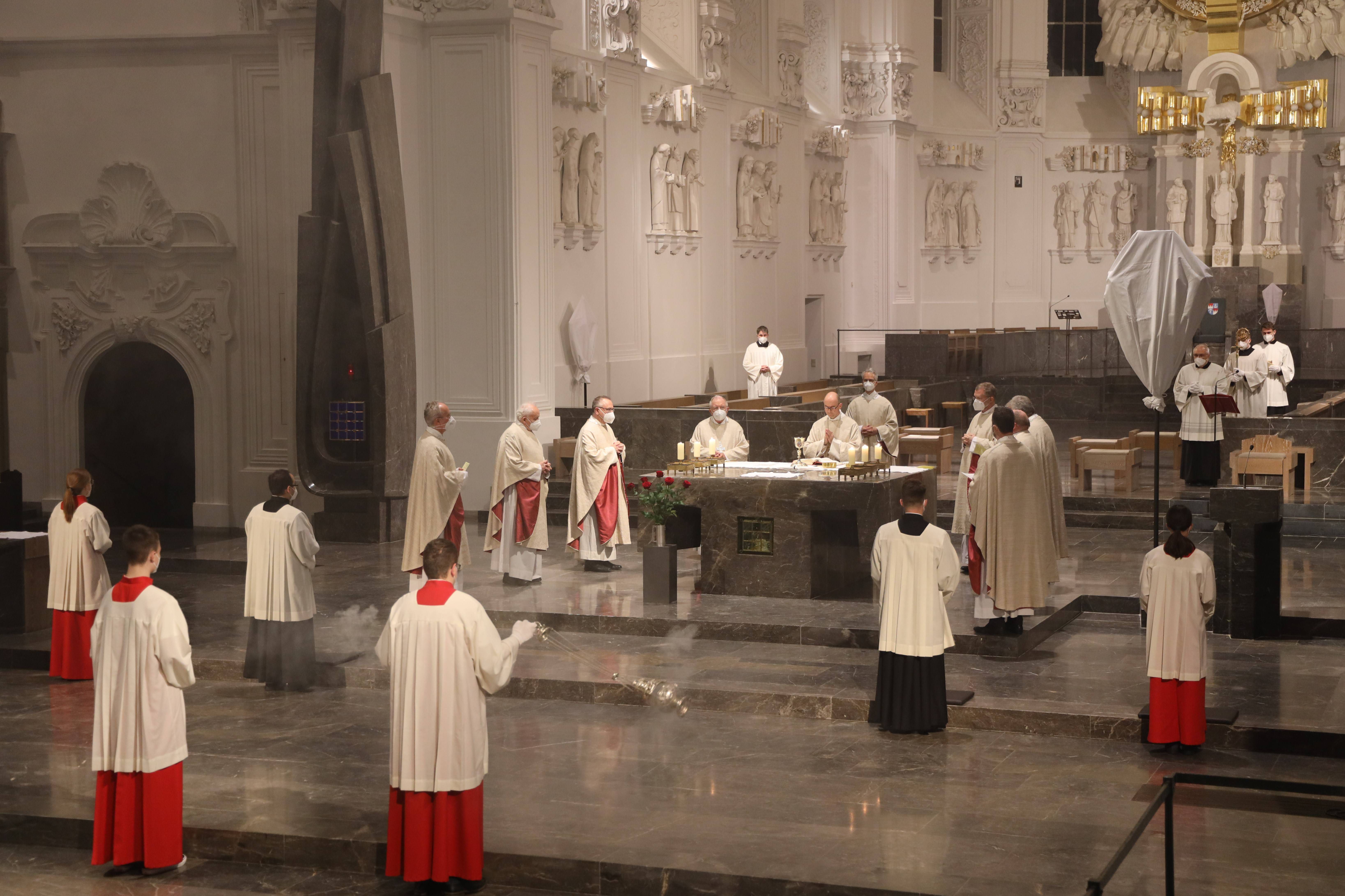 Würzburg (POW) Mit der Messe vom Letzten Abendmahl am Gründonnerstag, 1. April, hat Bischof Dr. Franz Jung die drei österlichen Tage vom Leiden und Sterben, von der Grabesruhe und der Auferstehung des Herrn eröffnet. In seiner Predigt betonte er, dass die Feier des Gottesdiensts wichtig sei, weil sie den Alltag unterbreche und die Augen öffne für das, was Gott an den Menschen tut. Das gelte unvermindert auch in der Coronapandemie: „Wir müssen auch das Staunen wieder lernen über einen Gott, der sich nicht zu schade ist, sich für die Menschen die Hände schmutzig zu machen. Und wir brauchen Menschen, die bereit sind, alles zu geben, so wie Jesus alles gegeben hat.“ Bischof Jung feierte den Gottesdienst unter Einhaltung der Coronaschutzvorschriften im Kiliansdom. Die übliche Fußwaschung musste daher entfallen. Stattdessen gaben sieben Personen davon Zeugnis, wo sie in ihrer Arbeit einen Dienst der Fußwaschung für andere leisten. Die Feier wurde live auf TV Mainfranken sowie im Internet übertragen.