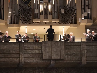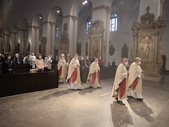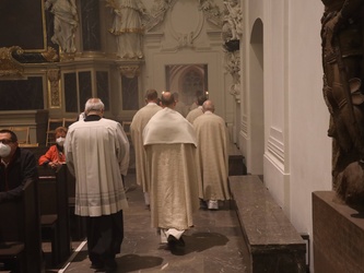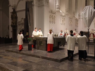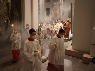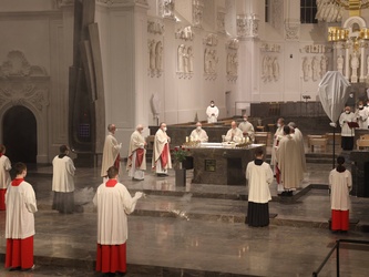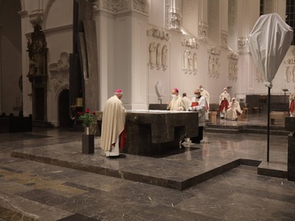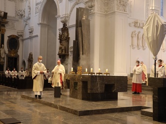Für die musikalische Gestaltung sorgten Domorganist Professor Stefan Schmidt und ein Ensemble der Herrenstimmen des Würzburger Domchors unter der Leitung von Domkapellmeister Professor Christian Schmid unter anderem mit der „Missa in Cena Domini“ von de la Forgeron, „In monte Oliveti“ von Giovanni Battista Martini und „Qui manducat carnem meam“. Nach dem Gloriagesang verstummten Glocken und Orgel. Erst beim Gloria in der Osternacht werden sie wieder erklingen. Am Ende der Messe übertrugen Bischof Jung und Mitglieder des Domkapitels das Allerheiligste in die Sepultur. Schmuck, Kerzen und Decken wurden vom Altar entfernt. Der Tabernakel blieb offen und leer.