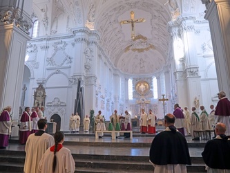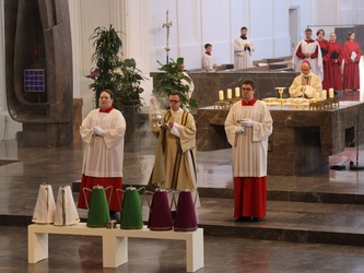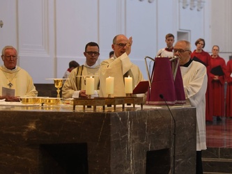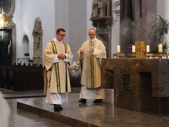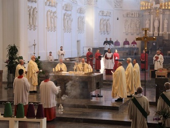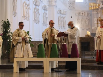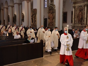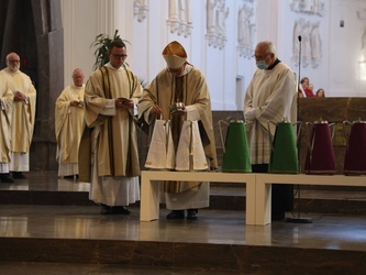 Würzburg (POW) Bischof Dr. Franz Jung hat am Dienstagnachmittag, 8. September die Heiligen Öle für alle 156 Pfarreiengemeinschaften und 17 großen Einzelpfarreien im Bistum Würzburg im Würzburger Kiliansdom geweiht: das Katechumenenöl für die Salbung der Taufbewerber, das Chrisamöl für Taufe, Firmung, Priester- und Bischofsweihe sowie für die Weihe von Kirchen und Altären, das Krankenöl für die Krankensalbung. Die Priester und Diakone erneuerten im Gottesdienst ihr Weiheversprechen. Wegen der Coronapandemie konnte der Gottesdienst nicht wie sonst üblich in der Karwoche gefeiert werden.