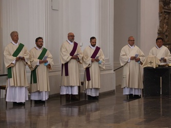 Dort, wo Christus als geistliche Mitte verlorengehe, träten die „eitlen Freuden“ an seine Stelle. „Man schlägt die Zeit tot, vergisst seine Berufung, vernachlässigt seine Pflichten und gibt sich mit anderen Dingen ab.“ Der Verlust der Mitte werde zum Einfallstor der Traurigkeit, aus der wiederum sich der Überdruss entwickle. „Alles wird beschwerlich. Am Ende macht der Diener des Herrn nur noch Dienst nach Vorschrift. Wie die Väter weiß Franziskus nur ein probates Mittel, um dem Überdruss wirksam zu begegnen: Er nimmt seine Zuflucht beim Gebet. Er hält aus vor dem Herrn, ohne wegzulaufen.“ Tomas von Celano, der eine Lebensbeschreibung über den heiligen Franziskus verfasst hat, schreibt darin: „Daher trachtete der Heilige danach, stets im Jubel des Herzens zu verharren, die Salbung des Geistes und das Öl der Freude zu bewahren.“ Genau darum gehe es in der Chrisammesse: „Wir erneuern unsere Salbung, die wir am Tag unserer Weihe empfangen haben. Und wir tragen hoffentlich den Jubel im Herzen wieder mit hinaus in unsere Pfarreien und an die Orte und zu den Menschen, zu denen wir uns gesandt wissen“, sagte Bischof Jung.