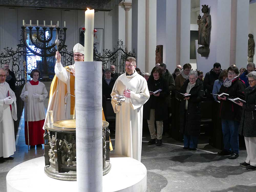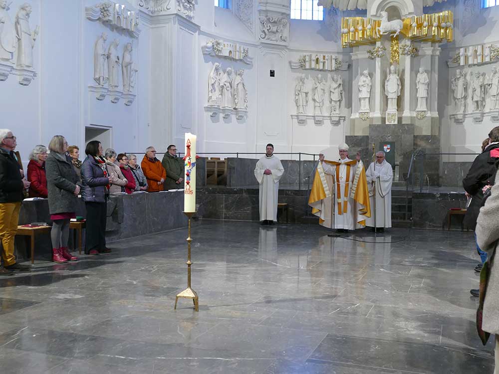 Zu Beginn der Feier versammelten sich alle am Taufbecken des Doms zum Taufgedächtnis. Begleitet von der Osterkerze, zogen die zukünftigen Begräbnisleiterinnen und Begräbnisleiter mit ihren Familien, Freunden und Vertretern der Gemeinden in den Hochchor.
