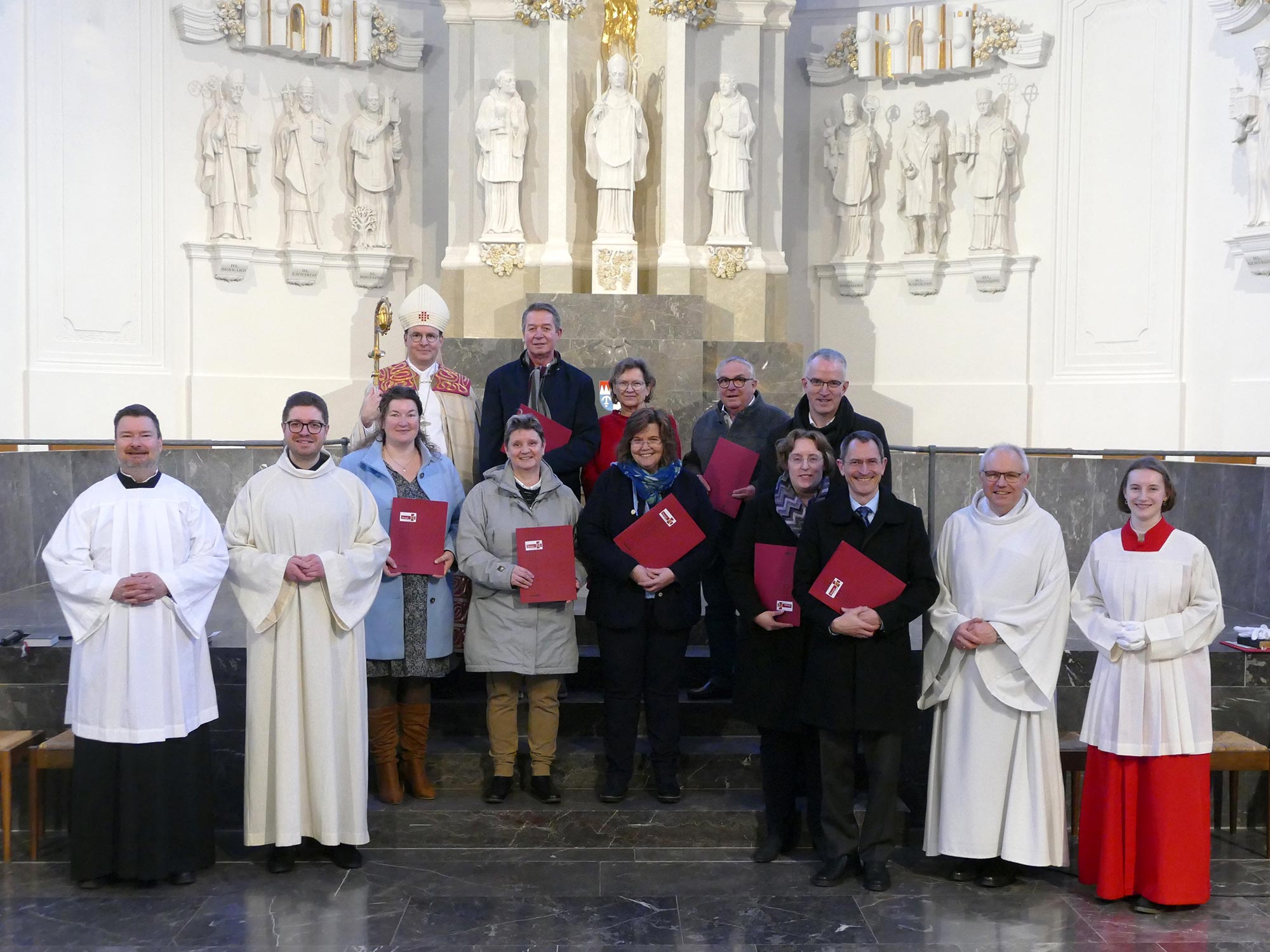 Fünf Frauen und fünf Männer hat Weihbischof Paul Reder am Sonntag, 26. Januar 2025, als ehrenamtliche Begräbnisleiter/-innen im Bistum Würzburg beauftragt. Er dankte den neuen Begräbnisleiter/-innen für die Bereitschaft zur Ausbildung und zum Dienst in den Pastoralen Räumen. Gottes Wirklichkeit und sein Reich auch im Angesicht des Todes zu verkünden, ist der bleibende Auftrag für den Dienst in der Sorge um Verstorbene und Trauernde.