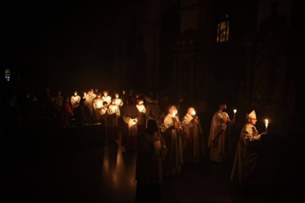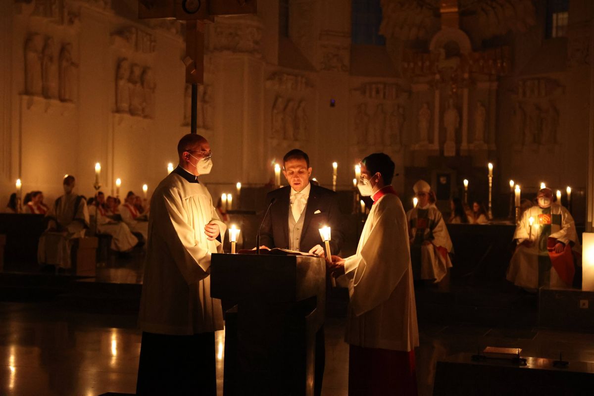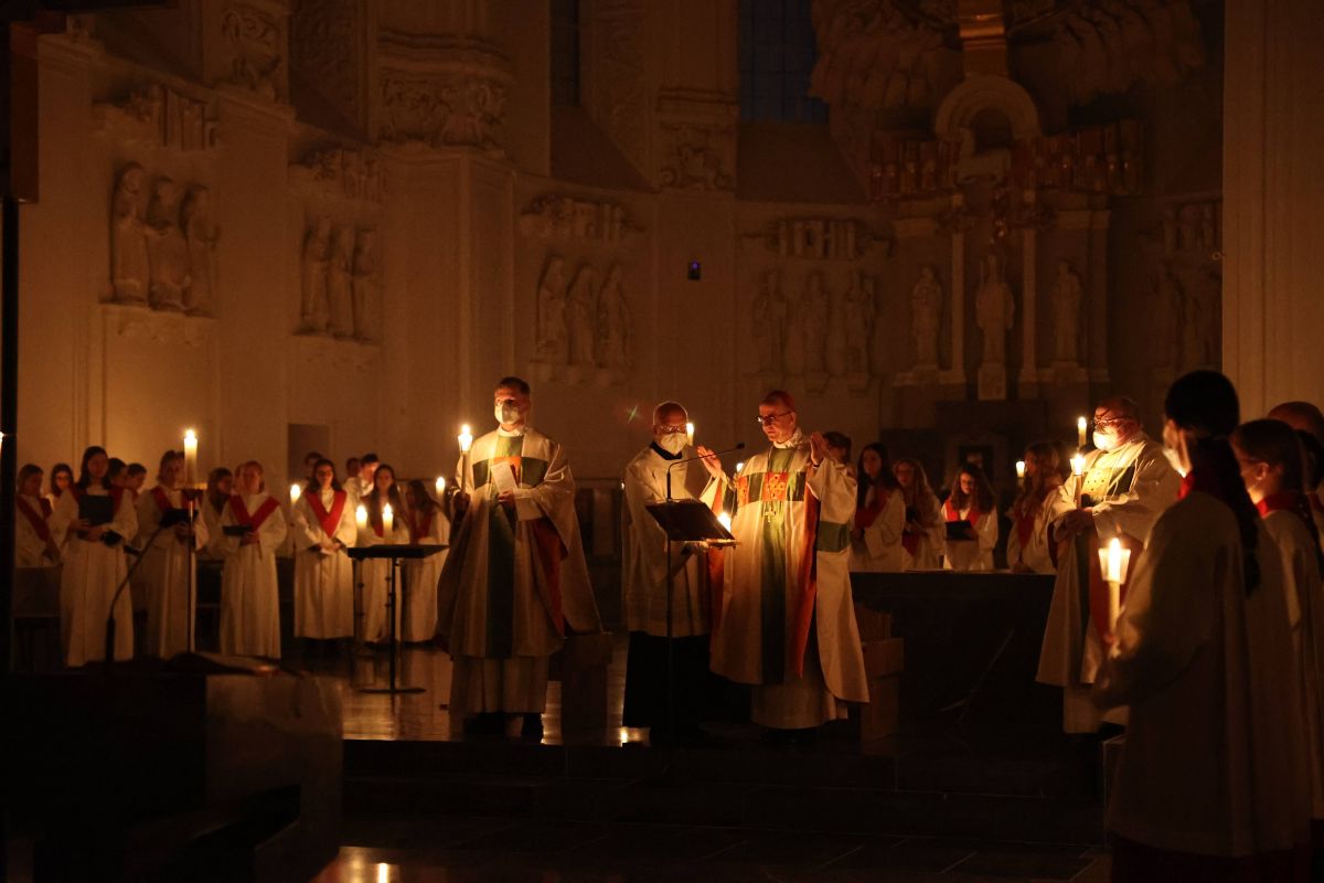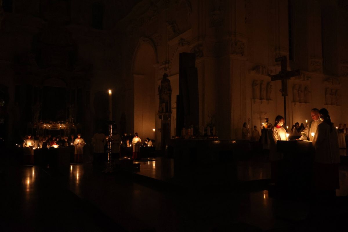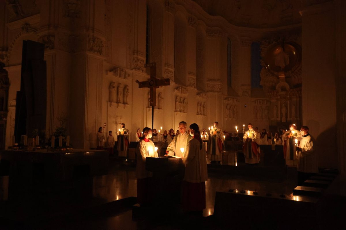 Die Feier der Osternacht begann am Feuer im Domkreuzgang. Nach der Segnung des Osterfeuers entzündete Bischof Jung die große Osterkerze an den Flammen mit den Worten: „Christus ist glorreich auferstanden vom Tod. Sein Licht vertreibe das Dunkel der Herzen.“ Danach wurde das Osterlicht in Begleitung von Mitgliedern des Domkapitels in den dunklen Kiliansdom getragen und an die Gläubigen weitergereicht. Während der Lichtfeier sang Diakon Dr. Martin Faatz das österliche Exsultet, den Lobgesang auf die Osterkerze. Lektoren trugen Lesungen aus dem Alten Testament vor. Beim Gloria läuteten die Glocken des Domes nach den stillen Tagen seit Gründonnerstag wieder. Lesung und Evangelium des Neuen Testaments berichteten von der Auferstehung Jesu. Der Lichtfeier schlossen sich die Tauffeier, Tauferneuerung und die Eucharistiefeier an. Den musikalischen Rahmen gestaltete neben Domorganist Professor Stefan Schmidt die Mädchenkantorei am Würzburger Dom unter der Leitung von Domkapellmeister Professor Christian Schmid mit „Laudate pueri Dominum op. 39,22“ von Felix Mendelssohn, „Surrexit pastor bonus op. 39,3“ sowie „O filii et filiae“ aus dem Oratorium Christus von Franz Liszt.