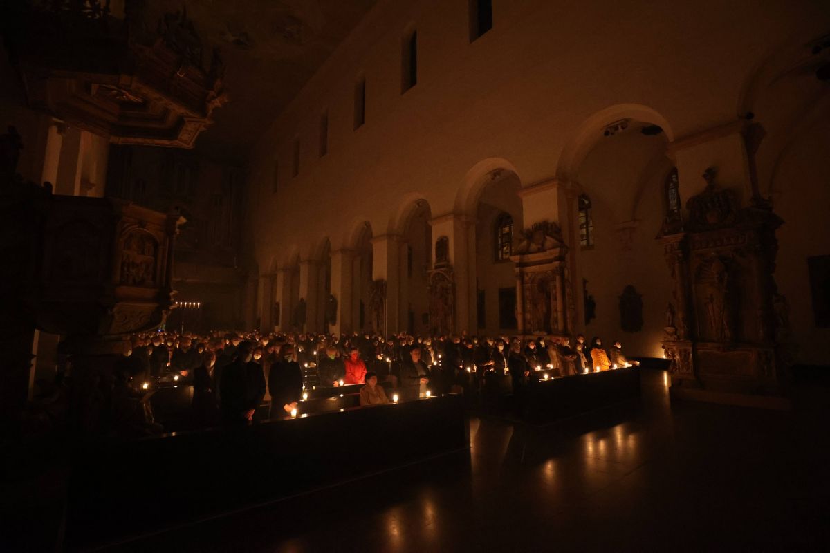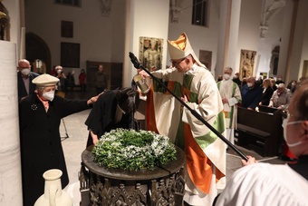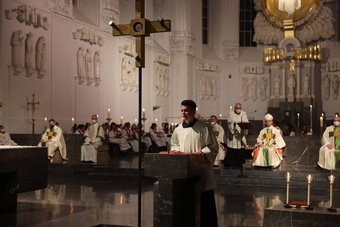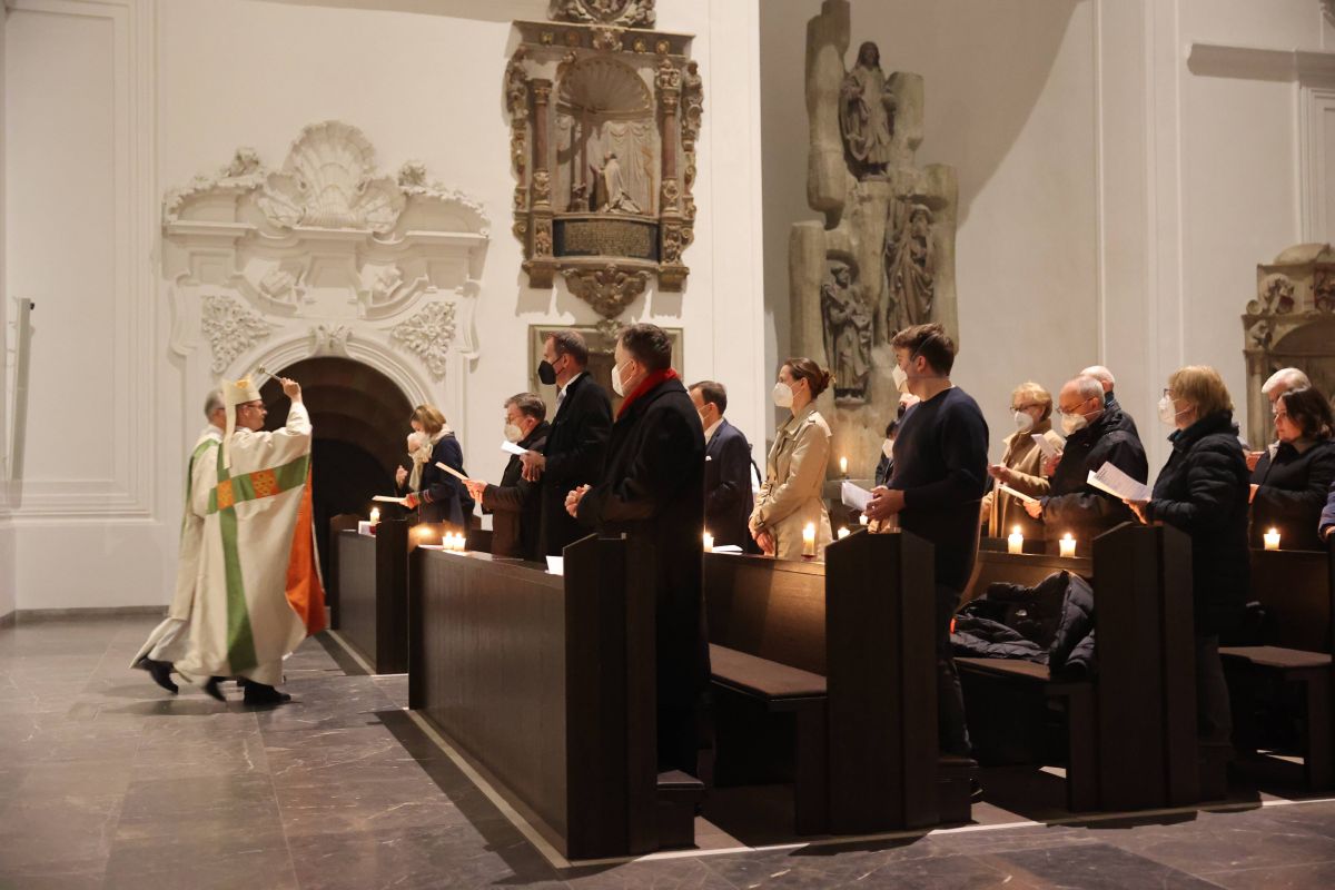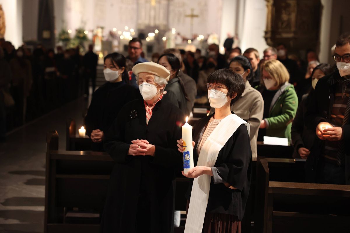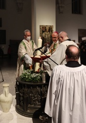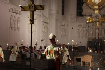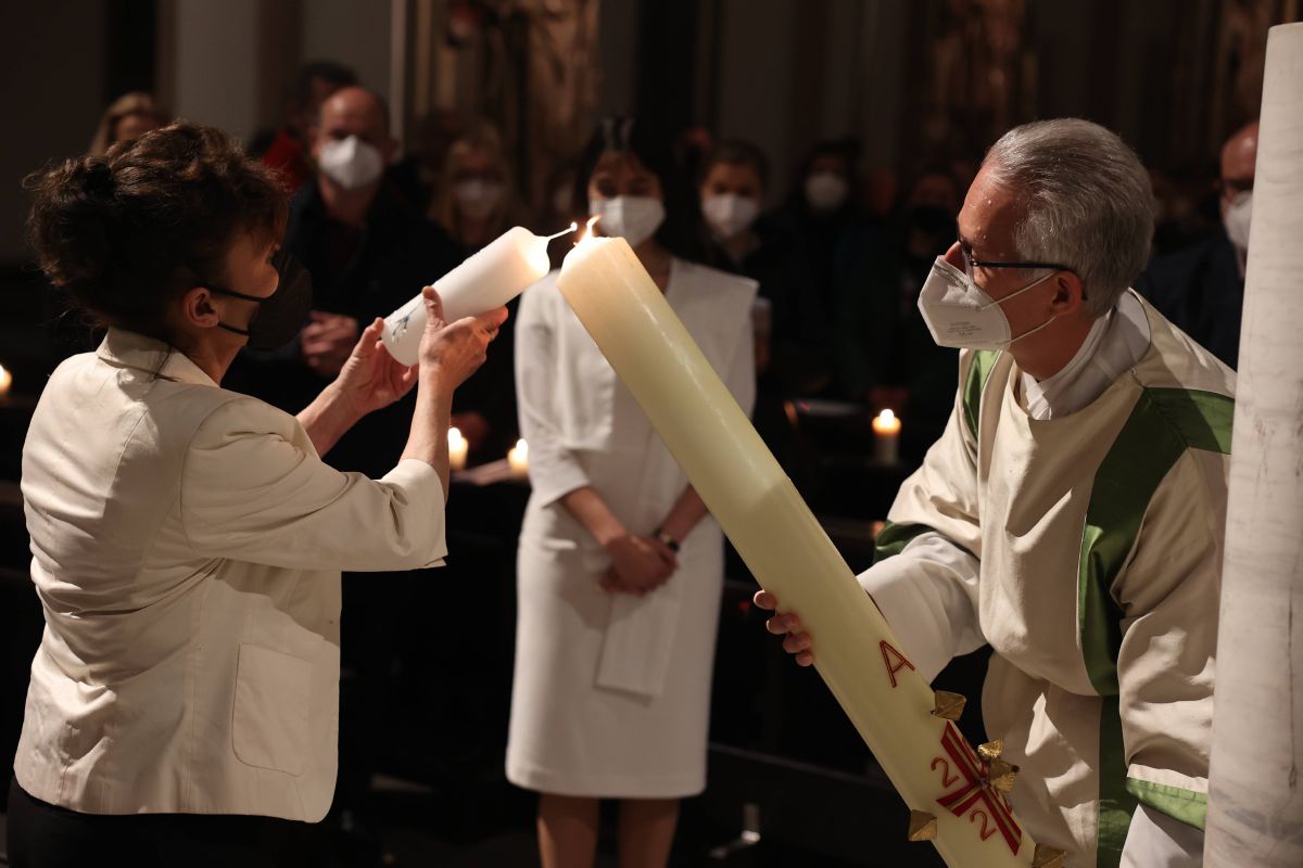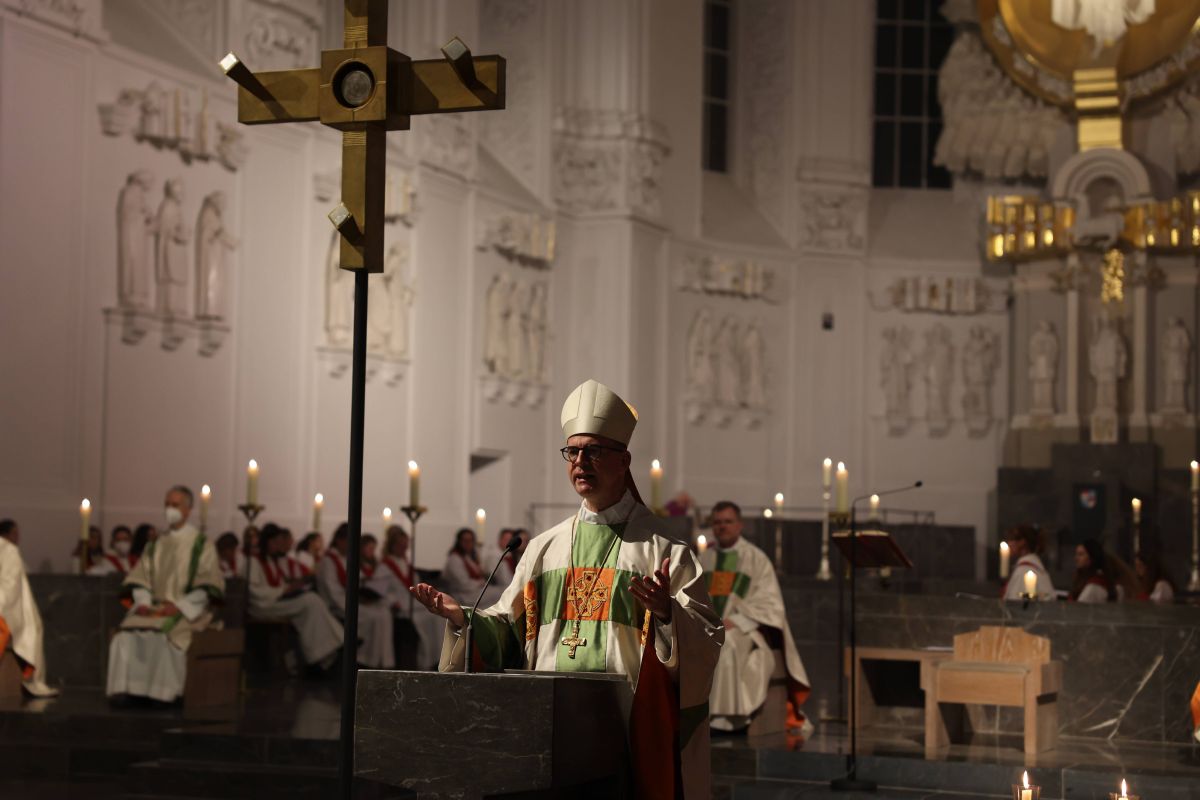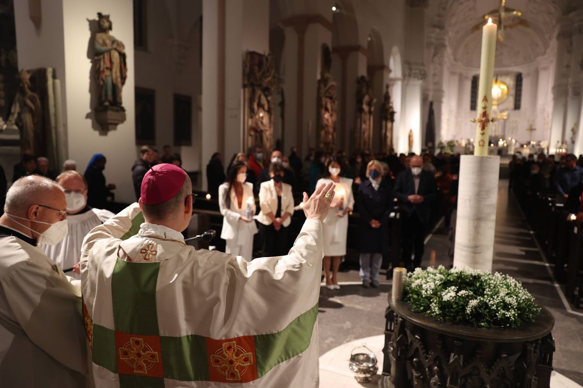 In der Predigt der Osternacht erinnerte Bischof Jung daran, dass Paulus betone, die Christen seien auf Jesu Tod getauft. „Die Taufe ist keine Kindersegnung, als die sie viele Gläubige erachten, wenn sie die Säuglinge und Neugeborenen zur Kirche bringen. Die Taufe auf den Tod Jesu Christi führt uns in eindrücklicher Weise vielmehr unsere Sterblichkeit vor Augen. Wir sind endliche Menschen. Als solche ist der Tod unser ständiger Wegbegleiter in seinen kleinen und großen Erscheinungsweisen.“ Der Herr, der hinabgestiegen sei in das Reich des Todes, sei bei den Menschen. „Das ist gut zu wissen in dieser Nacht, die die Nächte unseres Lebens symbolisiert wie keine andere“, sagte der Bischof.