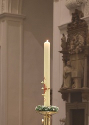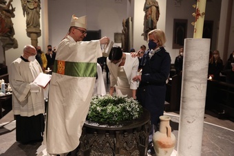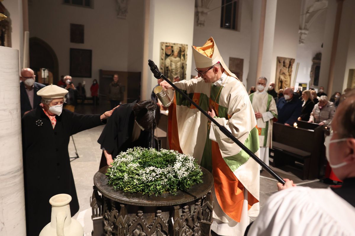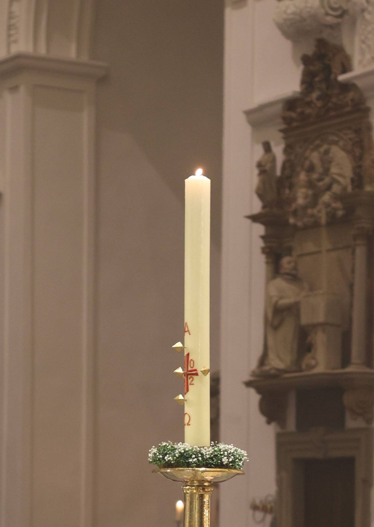 Die Osterkerze leuchte zu Beginn der Osternacht einsam in der dunklen Kirche. „So wird deutlich, dass jedes Licht von dieser Kerze stammt. Christus ist unser Licht.“ Das Taufkleid, das den Neugetauften angezogen werde, erinnere daran, dass sie den angezogen haben, der die Menschennatur angezogen hat, „um uns mit der Festfreude des Himmels zu überkleiden“. Paulus betonte, dass Christus „ein für alle Mal“ für die Sünde gestorben sei. „Ein großes Wort. Wir wissen alle, wie das mit den großen Worten im Leben ist, die wir ein für alle Mal geben. Sie wollen mühsam Tag für Tag neu bestätigt werden.“ Dieses „ein für alle Mal“ finde seinen Ausdruck bei der Taufe in der Salbung mit dem kostbaren Chrisam. „Sie gehören ein für alle Mal Gott, weil sie vom Herrn gesiegelt wurden. Sie wurden damit auch versiegelt gegen alle Angriffe des Bösen.“