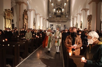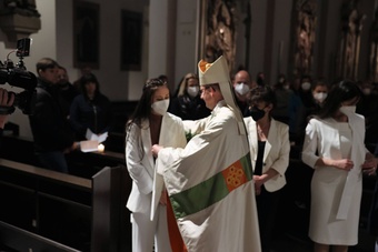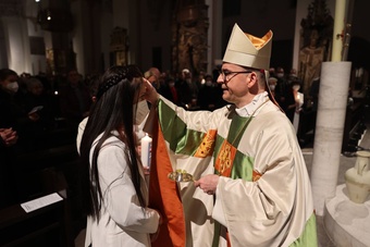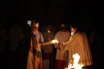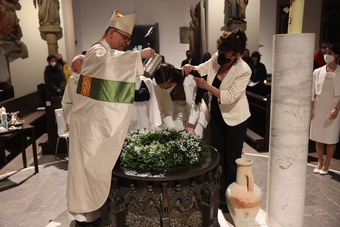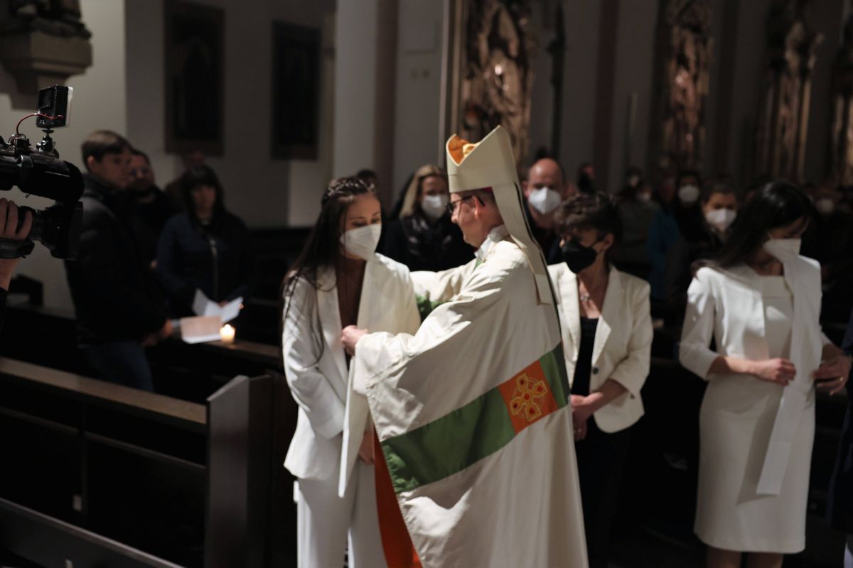 Sie rufe ihn daraufhin mit „Rabbuni“ und nenne ihn ihren Meister. „Als Meister erweist sich Jesus dadurch, dass er Maria befähigen möchte, ihr Leben selbst in die Hand zu nehmen.“ Das unterscheide ihn von den falschen Meistern und Gurus dieser Welt, die Menschen nur abhängig machen wollten. Der Halt Jesu jedoch mache frei und führe ins Leben. Als Maria Jesus festhalten will, mache dieser sie darauf aufmerksam, dass sie in diesem Reflex wie gelähmt sei. „Wenn du dich wieder spürst und dein Herz wieder schlägt und der innere Krampf sich löst, dann kannst du den Kopf auch erheben. Du darfst erhobenen Hauptes deinen Weg gehen“, sagte der Bischof. Er ermunterte, auf den auferstandenen Jesus zu schauen. „Dann wird die Osterfreude und das Licht der Osternacht euer Gesicht zum Leuchten bringen. Und wenn euer Gesicht so von innen her strahlt, wenn ihr nicht mehr von der Scham, sondern der Freude überflutet werdet, dann könnt ihr wie Maria von Magdala zu Botinnen und Boten der Osterfreude für andere werden.“
