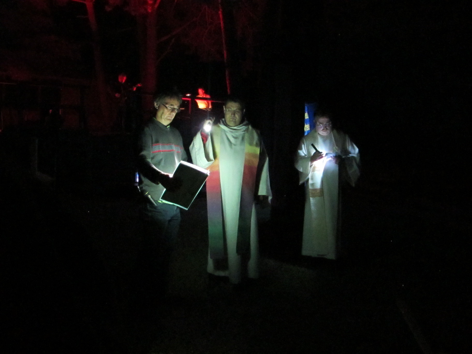 Nach dem Hereinbrechen der Nacht wurde ein ökumenischer Gottesdienst unter freiem Himmel gefeiert, der durch seine tiefgehende Symbolik den Glauben der Menschen in wirklich ganzheitlicher Weise aufgegriffen hat und dies in verschiedenen Liedern, Symbolhandlungen und Gebeten ausgedrückt hat. Während des Evangeliums wurde Gottes Wort zeichenhaft in der Ostererze durch die versammelte Gemeinde getragen um Gottes Gegenwart spürbar werden zu lassen.