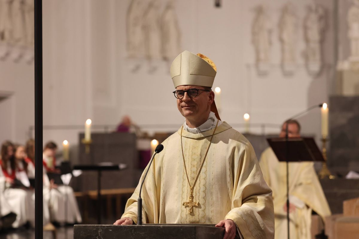 In der Osternacht legte der Bischof Hilde Domins Gedicht „Bitte“ aus. „Das Gedicht spricht mich so an, weil man es auch als Ostergedicht lesen kann.“ Erlösung geschehe nicht am Leiden vorbei. Jesus sei in die Nacht des Todes hinabgestiegen, um die Menschen mit sich ins neue Leben aus Gott zu führen. „Der Heilige Geist, den wir auf das Taufwasser herabrufen, macht das Wasser zur Quelle neuen Lebens. Über dem Taufwasser schwebt deshalb die Taube mit dem Ölzweig, der uns den Frieden mit Gott durch die Auferstehung Christi verkündet.“