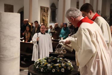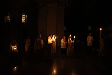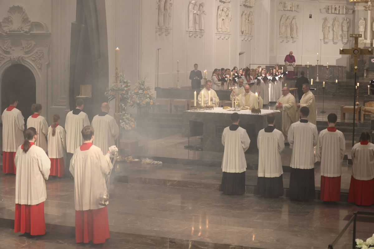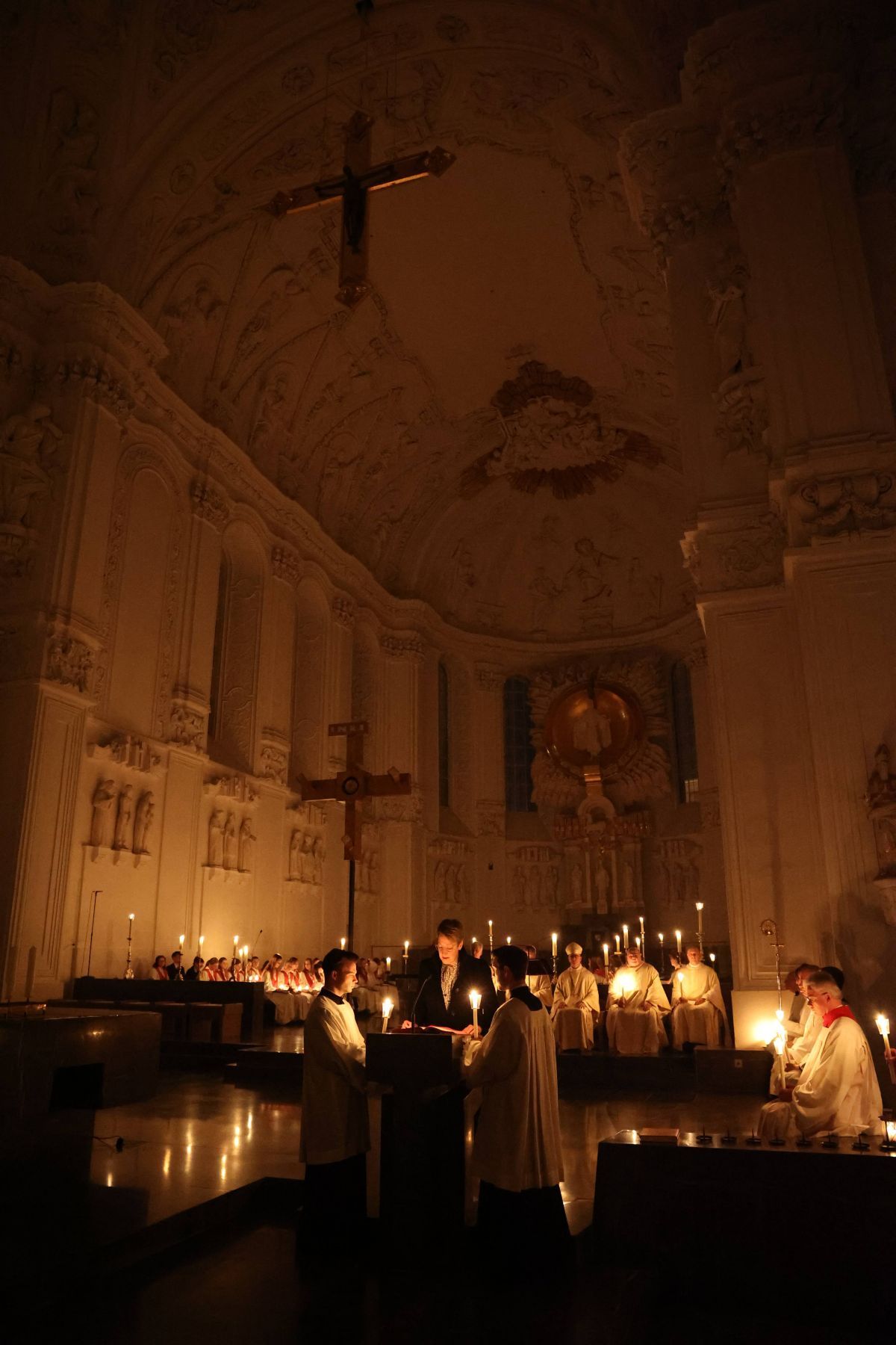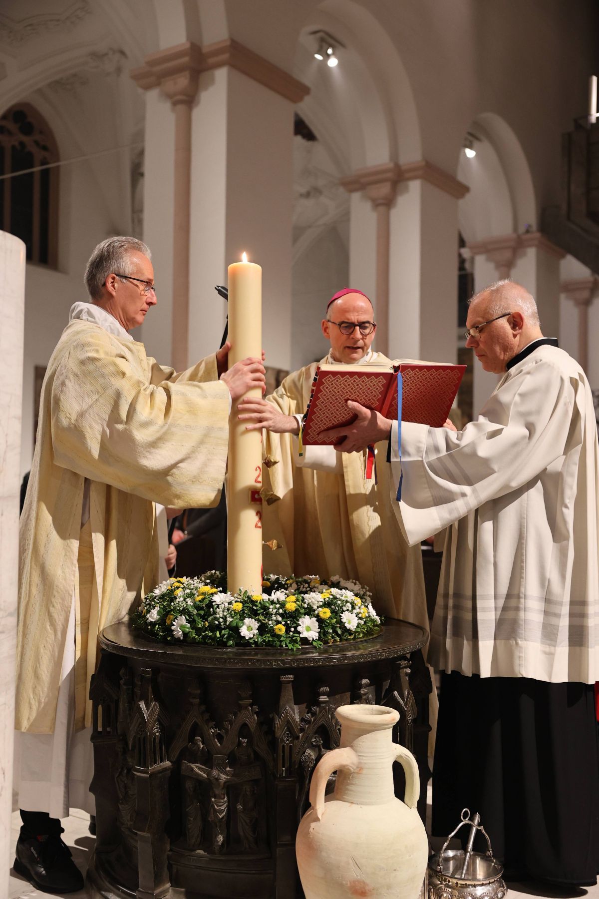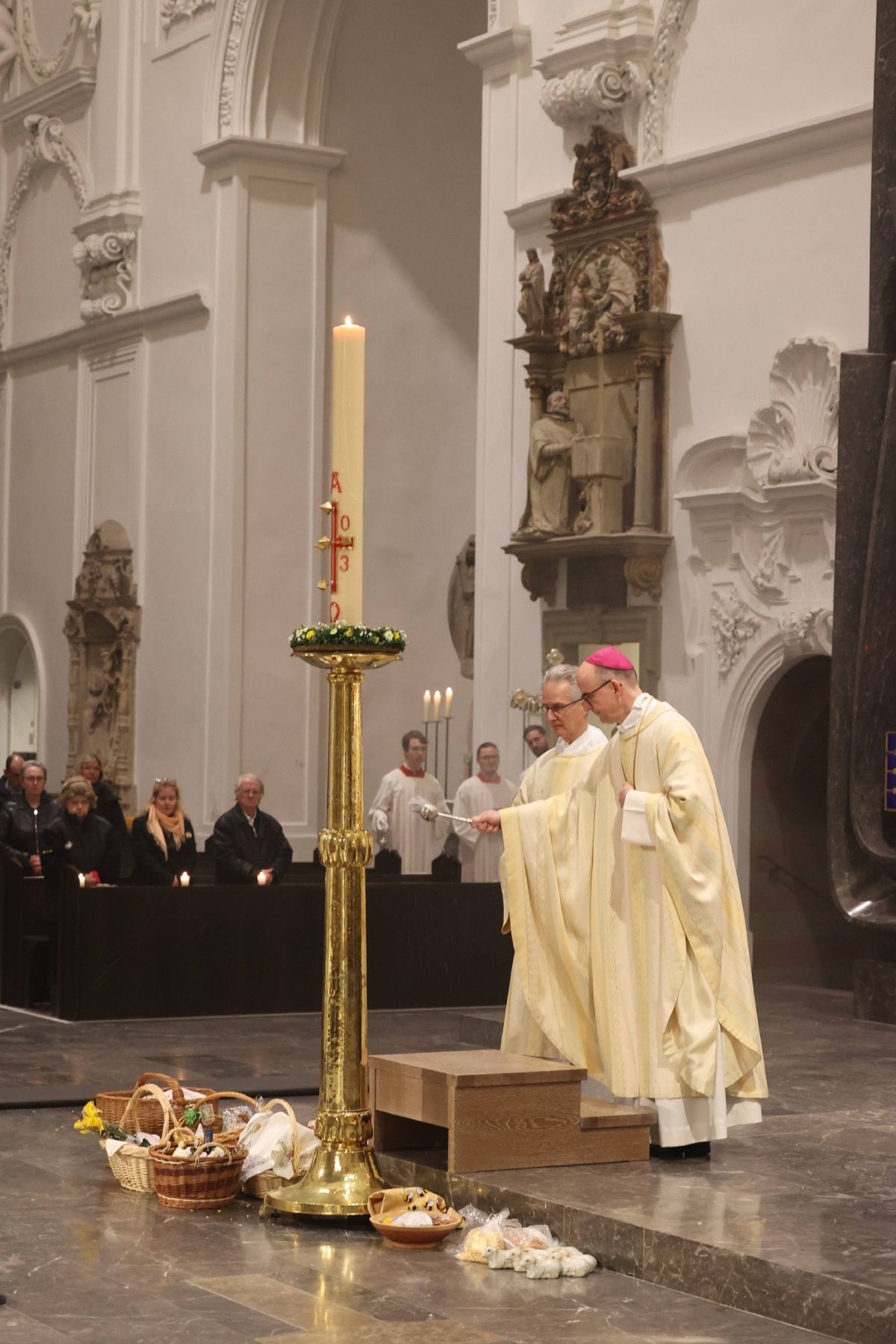 Die Feier der Osternacht begann am Feuer im Innenhof des Domkreuzgangs. Nach der Segnung des Osterfeuers entzündete Bischof Jung die große Osterkerze an den Flammen mit den Worten: „Christus ist glorreich auferstanden vom Tod. Sein Licht vertreibe das Dunkel der Herzen.“ Danach wurde das Osterlicht in Begleitung von Mitgliedern des Domkapitels in den dunklen Kiliansdom getragen und an die Gläubigen weitergereicht. Während der Lichtfeier sang Diakon Dr. Martin Faatz das österliche Exsultet, den Lobgesang auf die Osterkerze. Lektoren trugen Lesungen aus dem Alten Testament vor. Beim Gloria läuteten die Glocken des Domes nach den stillen Tagen seit Gründonnerstag wieder. Lesung und Evangelium des Neuen Testaments berichteten von der Auferstehung Jesu. Der Lichtfeier schlossen sich die Tauferneuerung und die Eucharistiefeier an. Den musikalischen Rahmen gestaltete neben Domorganist Professor Stefan Schmidt die Mädchenkantorei am Würzburger Dom unter der Leitung von Domkapellmeister Alexander Rüth und dessen Assistentin Lena Herber mit „Antwortgesängen zur Osternacht“ von Alexander Rüth und Otmar Faulstich, „Surrexit pastor bonus, Laudate pueri“ von Felix Mendelssohn Bartholdy, „O filii et filiae“ (aus Oratorium Christus) von Franz Liszt und der „Messe pour deux voix égales“ von Cécile Chaminade.