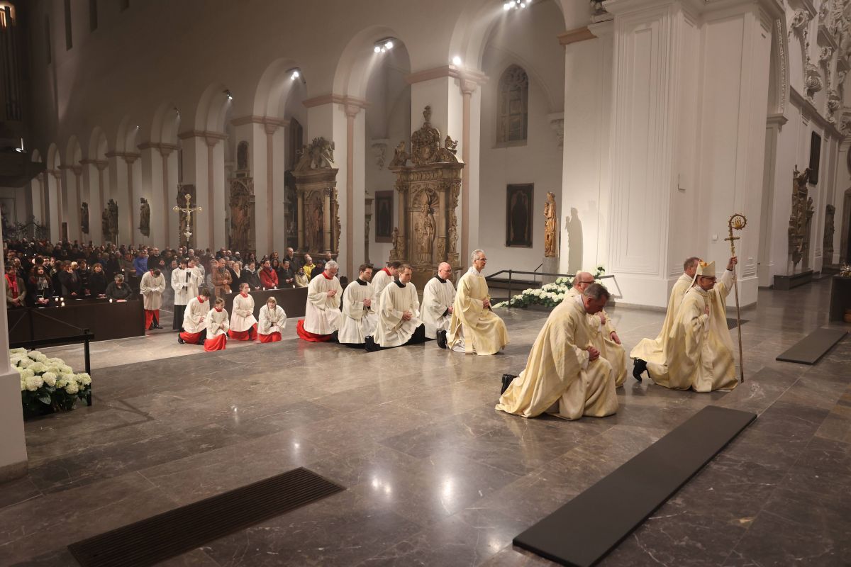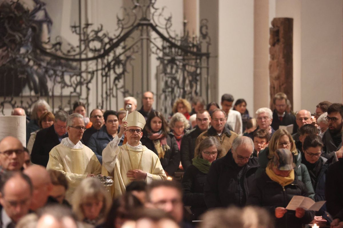 Das gleißende Licht am Ostermorgen versinnbildlicht nach den Worten von Bischof Jung, dass zwar am Karfreitag des Lebens Türen zugefallen sind, sich aber am Ostermorgen auch ganz neue Türen geöffnet haben. „Wir dürfen lernen, dass in jedem Ende zugleich etwas Neues beginnt.“ Das gehe aber nur, wenn es gelinge, alte Bilder aufzugeben. Es brauche Zeit und Menschen, die einem zur Seite stehen, um sich auf Neues einlassen zu können. Das Bild vom leeren Grab schließlich sage lediglich, wo Jesus nicht ist. „Aber wo er sich befindet, das muss man erst noch herausfinden.“ Erneut müssten sich die Frauen und die Apostel auf den Weg machen, um Jesus zu suchen. „Sie finden ihn überall da, wo Menschen sich nicht einfach abgeben mit dem scheinbar Unmöglichen. Wo Menschen gegen Ungerechtigkeit aufstehen, für die Freiheit eintreten und den Finger in die Wunden dieser Welt legen, um sie zu heilen.“