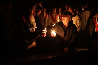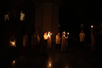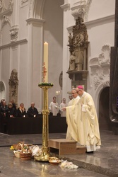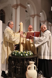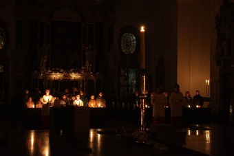 Die Feier der Osternacht begann am Feuer im Innenhof des Domkreuzgangs. Nach der Segnung des Osterfeuers entzündete Bischof Jung die große Osterkerze an den Flammen mit den Worten: „Christus ist glorreich auferstanden vom Tod. Sein Licht vertreibe das Dunkel der Herzen.“ Danach wurde das Osterlicht in Begleitung von Mitgliedern des Domkapitels in den dunklen Kiliansdom getragen und an die Gläubigen weitergereicht. Während der Lichtfeier sang Diakon Dr. Martin Faatz das österliche Exsultet, den Lobgesang auf die Osterkerze. Lektoren trugen Lesungen aus dem Alten Testament vor. Beim Gloria läuteten die Glocken des Domes nach den stillen Tagen seit Gründonnerstag wieder. Lesung und Evangelium des Neuen Testaments berichteten von der Auferstehung Jesu. Der Lichtfeier schlossen sich die Tauferneuerung und die Eucharistiefeier an. Den musikalischen Rahmen gestaltete neben Domorganist Professor Stefan Schmidt die Mädchenkantorei am Würzburger Dom unter der Leitung von Domkapellmeister Alexander Rüth und dessen Assistentin Lena Herber mit „Antwortgesängen zur Osternacht“ von Alexander Rüth und Otmar Faulstich, „Surrexit pastor bonus, Laudate pueri“ von Felix Mendelssohn Bartholdy, „O filii et filiae“ (aus Oratorium Christus) von Franz Liszt und der „Messe pour deux voix égales“ von Cécile Chaminade.