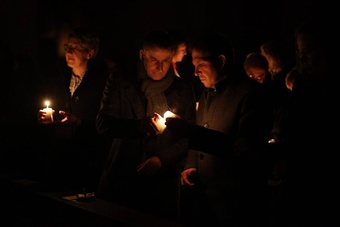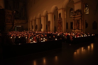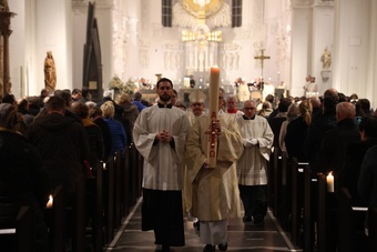Das gleißende Licht am Ostermorgen versinnbildlicht nach den Worten von Bischof Jung, dass zwar am Karfreitag des Lebens Türen zugefallen sind, sich aber am Ostermorgen auch ganz neue Türen geöffnet haben. „Wir dürfen lernen, dass in jedem Ende zugleich etwas Neues beginnt.“ Das gehe aber nur, wenn es gelinge, alte Bilder aufzugeben. Es brauche Zeit und Menschen, die einem zur Seite stehen, um sich auf Neues einlassen zu können. Das Bild vom leeren Grab schließlich sage lediglich, wo Jesus nicht ist. „Aber wo er sich befindet, das muss man erst noch herausfinden.“ Erneut müssten sich die Frauen und die Apostel auf den Weg machen, um Jesus zu suchen. „Sie finden ihn überall da, wo Menschen sich nicht einfach abgeben mit dem scheinbar Unmöglichen. Wo Menschen gegen Ungerechtigkeit aufstehen, für die Freiheit eintreten und den Finger in die Wunden dieser Welt legen, um sie zu heilen.“