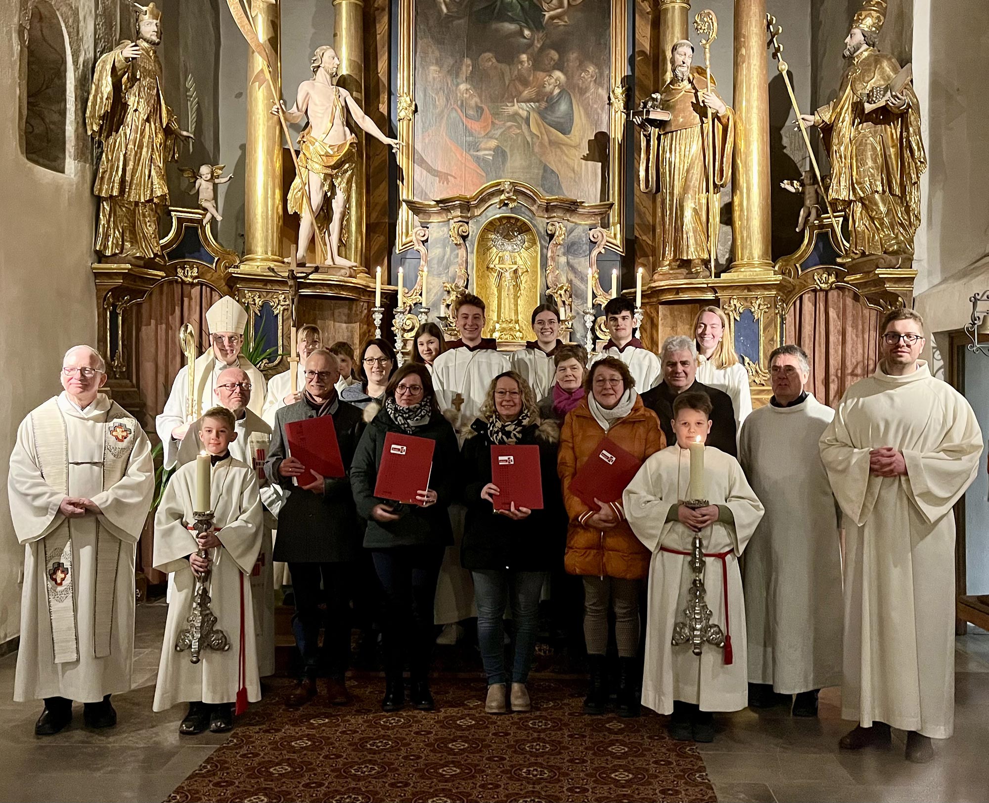 Die Wort-Gottes-Feier begann am Taufstein der Kirche mit einem Taufgedächtnis. Nach der Verkündigung und der Auslegung des Wortes Gottes überreichte Weihbischof Paul die bischöflichen Urkunden und sprach das Beauftragungsgebet über die neuen Gottesdienstbeauftragten. Gemeinsam mit den Neubeauftragten verehrten allen Mitfeiernden das Wort Gottes und legten ein Weihrauchkorn als Zeichen der Verehrung auf glühende Kohlen. Domkapitular Pfarrer Thomas Keßler dankte am Ende der Feier den neuen Gottesdienstbeauftragten für deren Bereitschaft, die lange Zeit der Ausbildung auf sich zu nehmen und sich nun in vielfältiger Weise als Vorsteherinnen und Vorsteher von Gottesdiensten zu engagieren.