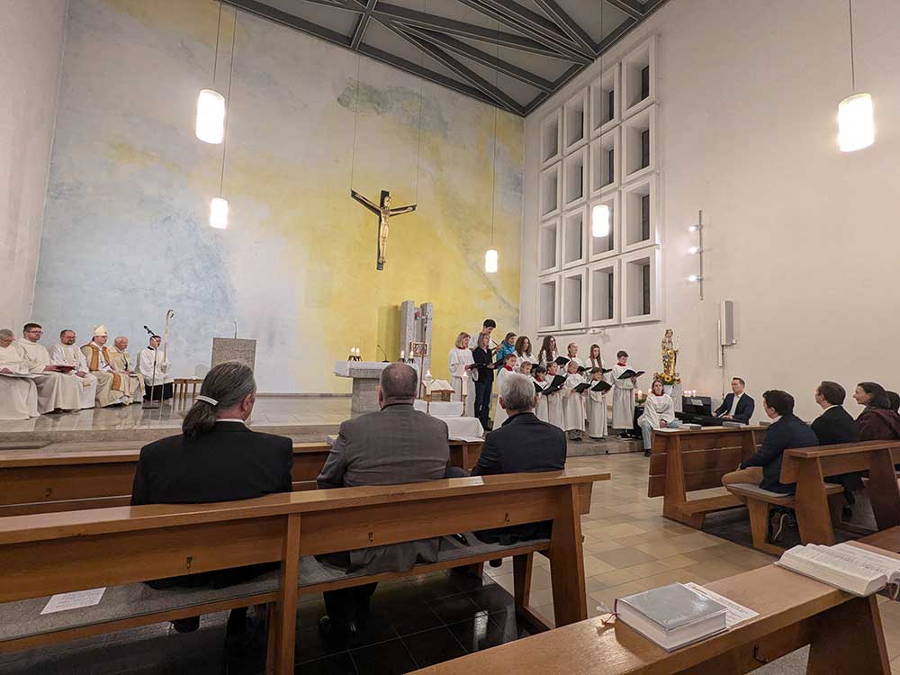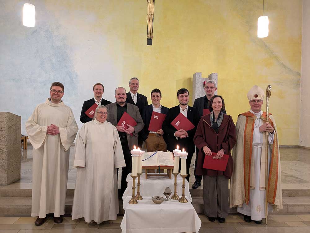 Die Wort-Gottes-Feier begann mit einer Erinnerung an die Taufe, die die Grundlage zum Dienst als Liturgin und Liturge ist. Nach der Verkündigung und der Auslegung des Wortes Gottes überreichte Weihbischof Paul die bischöflichen Urkunden und sprach das Beauftragungsgebet über die neuen Gottesdienstbeauftragten. Gemeinsam mit den Neubeauftragten verehrten alle Mitfeiernden das Wort Gottes und legten ein Weihrauchkorn als Zeichen der Verehrung auf glühende Kohlen. Am Ende der Feier dankte Stephan Specht im Namen der Ausbildungsgruppe für die Mitfeier der Beauftragung und für den gemeinsamen Ausbildungskurs. Der Gottesdienst wurde musikalisch durch den Gemeindechor St. Bruno gestaltet, der aus allen aktiven Ministrant/-innen und weiteren Sänger/-innen besteht. Ein Empfang vor der Kirche schloss sich an, bei dem die Familienangehörigen und Freunde mit den neuen Gottesdienstbeauftragten ins Gespräch kamen.