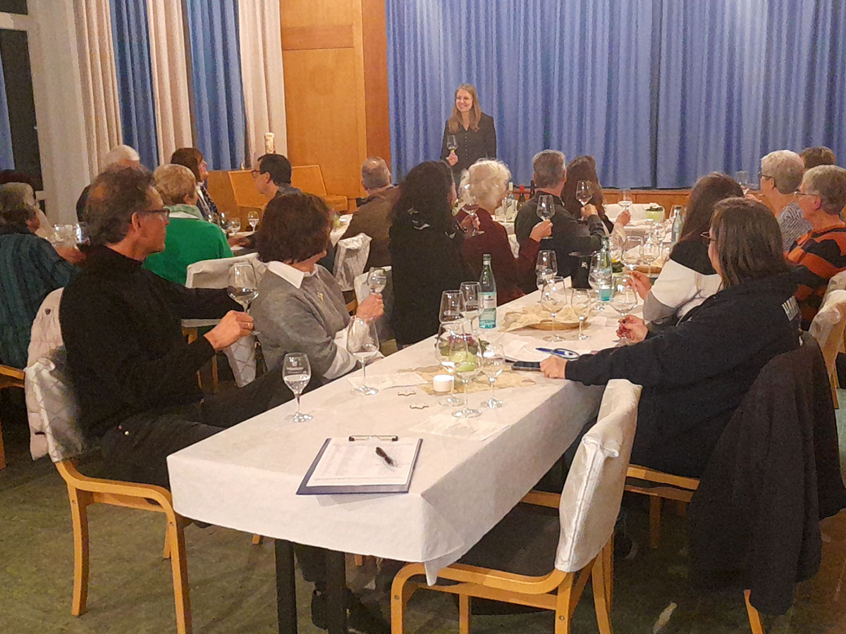 Theologie und Oenologie hielten sich die Waage bei der Messweinprobe im Weinort Großheubach. Knapp zwei Dutzend liturgische Ehrenamtliche aus umliegenden Pfarreien hatten Weine aus Ihren Sakristeien zum Fortbildungsabend mitgebracht und erzählten, warum gerade dieser Wein vor Ort bei der Messe Verwendung findet. Eva Brockmann leitete die Verkostung an und beschrieb die Eigenheiten eines jeden Weines. Dabei offenbarte sie ebenso großes Fachwissen wie Improvisationstalent, denn es war ja im Vorfeld nicht klar, welche Weine am Abend zur Verfügung stehen würden.